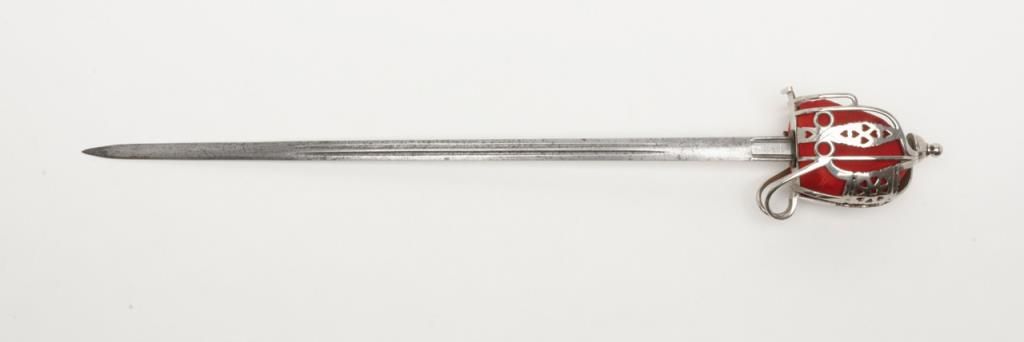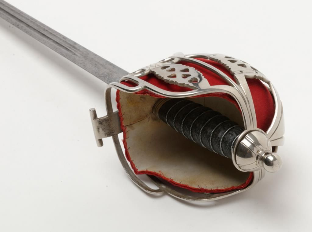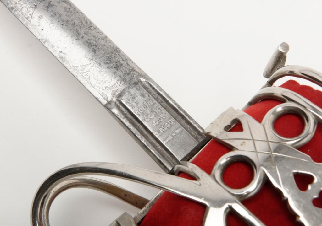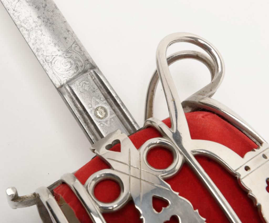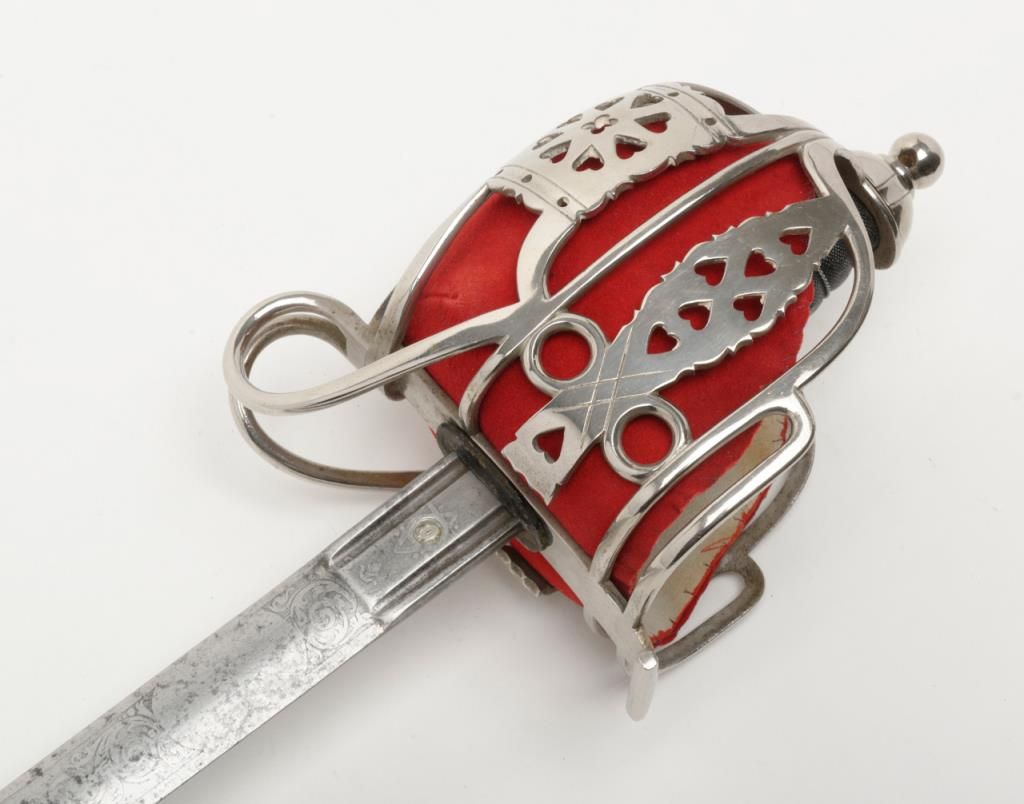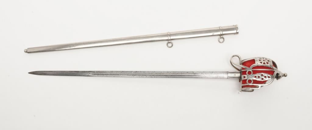 Scottish Victorian era basket hilt sword by Moore and Taget of Glasgow, Scotland circa about 1870 remaining in good to very good condition with its original scabbard. The blade shows some light to moderate rust and erosion with strong traces oforiginal etching and good makers name etched on the ricasso. The hilt and scabbard are good to very good with some bubbling and crazing to the nickel finish and just normal aging with a little polishing. The sharkskin grip shows some wear atthe edges but is at least very good plus. A very attractive basket hilt by a well-known maker. Est.: $800-$1600