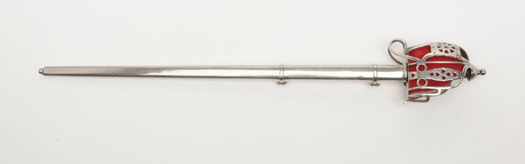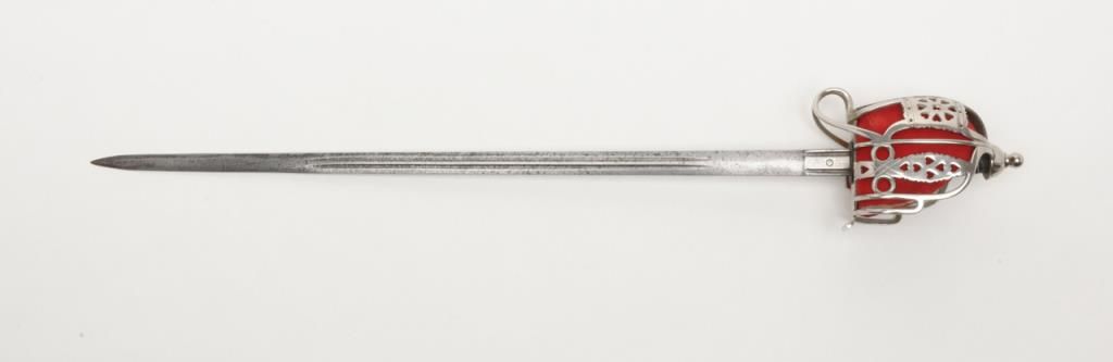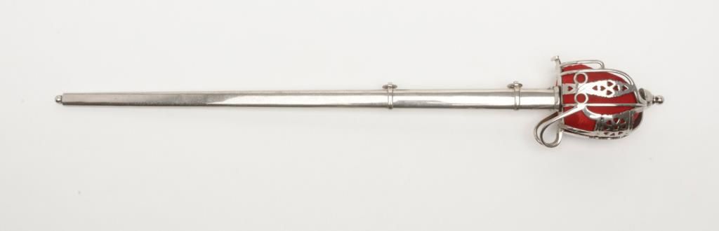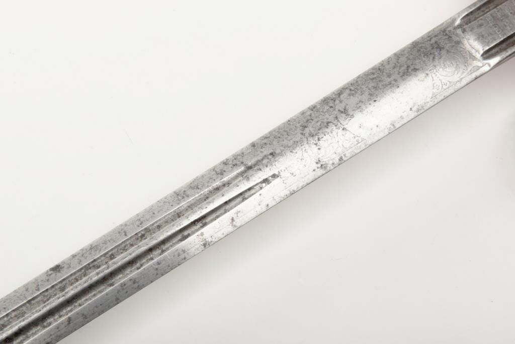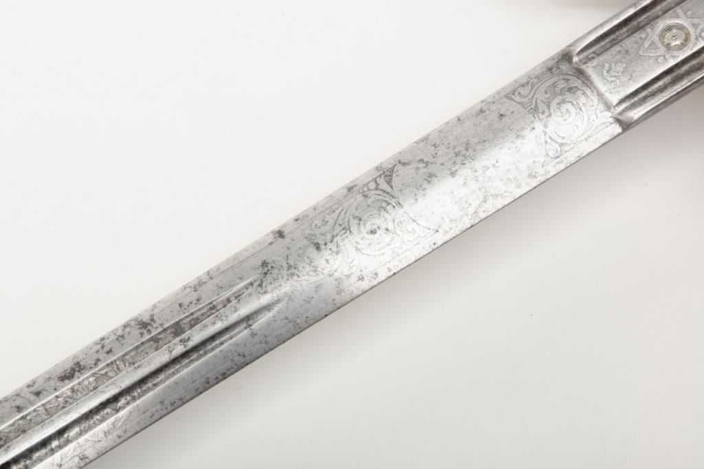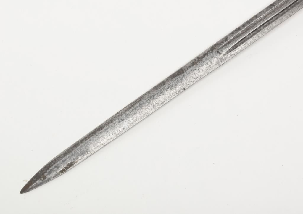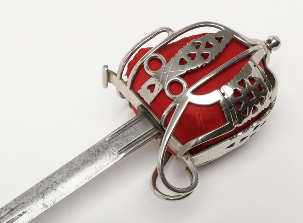Scottish Victorian era basket hilt sword by Moore and Taget of Glasgow, Scotland circa about 1870 remaining in good to very good condition with its original scabbard. The blade shows some light to moderate rust and erosion with strong traces oforiginal etching and good makers name etched on the ricasso. The hilt and scabbard are good to very good with some bubbling and crazing to the nickel finish and just normal aging with a little polishing. The sharkskin grip shows some wear atthe edges but is at least very good plus. A very attractive basket hilt by a well-known maker. Est.: $800-$1600