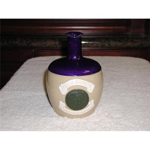 Scottish Whiskey Jug. Cobalt Blue color on top, and beige stoneware on bottom. Imprint "Whiteley" and "Scotland" in stoneware, on bottom. There are more imprints, but very hard to read. Emblem on front of jug is raised. Top reads "Kings Ransom" Middle is Whiteley Crest with "Whiteley of Leith" and "Voyaged Liqueor Whiskey", and bottom is "Round the World".