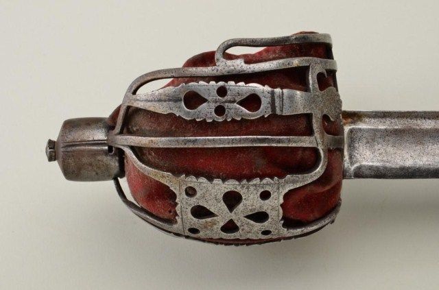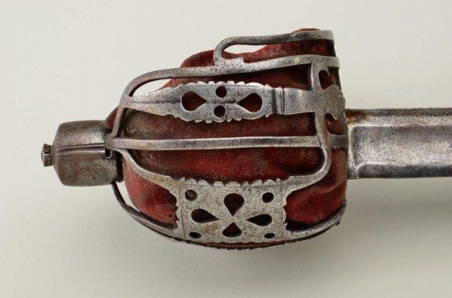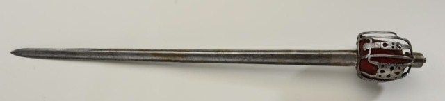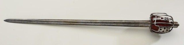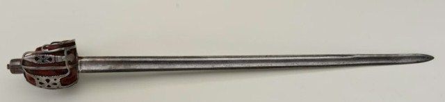 Scottish basket hilt (Back sword) of cavalry style circa about 1780 in good original condition. The sword measures 40” overall with 33” blade measures almost 1-5/8” across at ricasso. The blade and hilt show light to moderate pitting and normal aging with a gray patina. The shark skin or ray skin grip is good but missing its wire wrap and the basket is lined with its period velvet. An attractive sword made at about the time ofthe American Revolution. Est.;$2,500-$5,000.