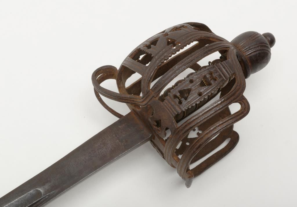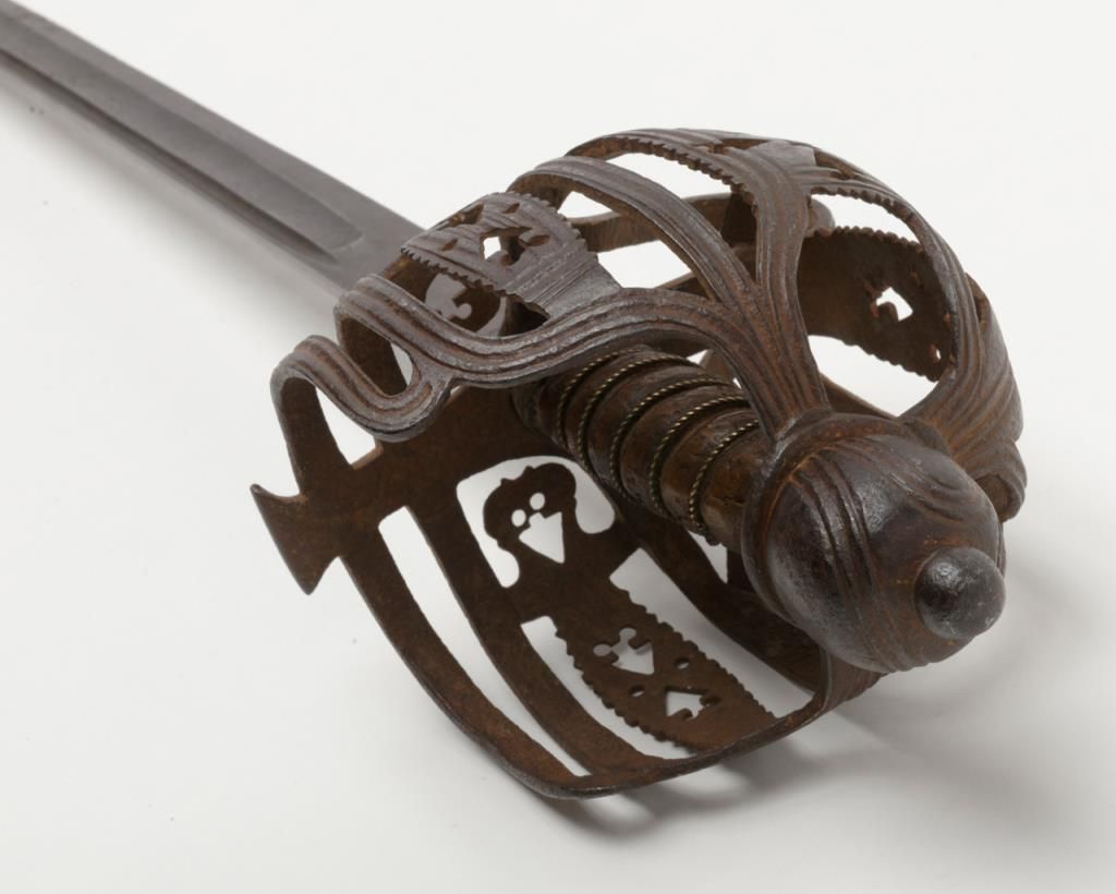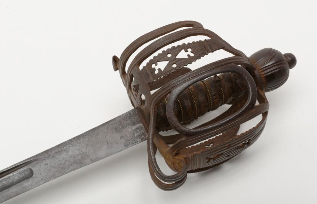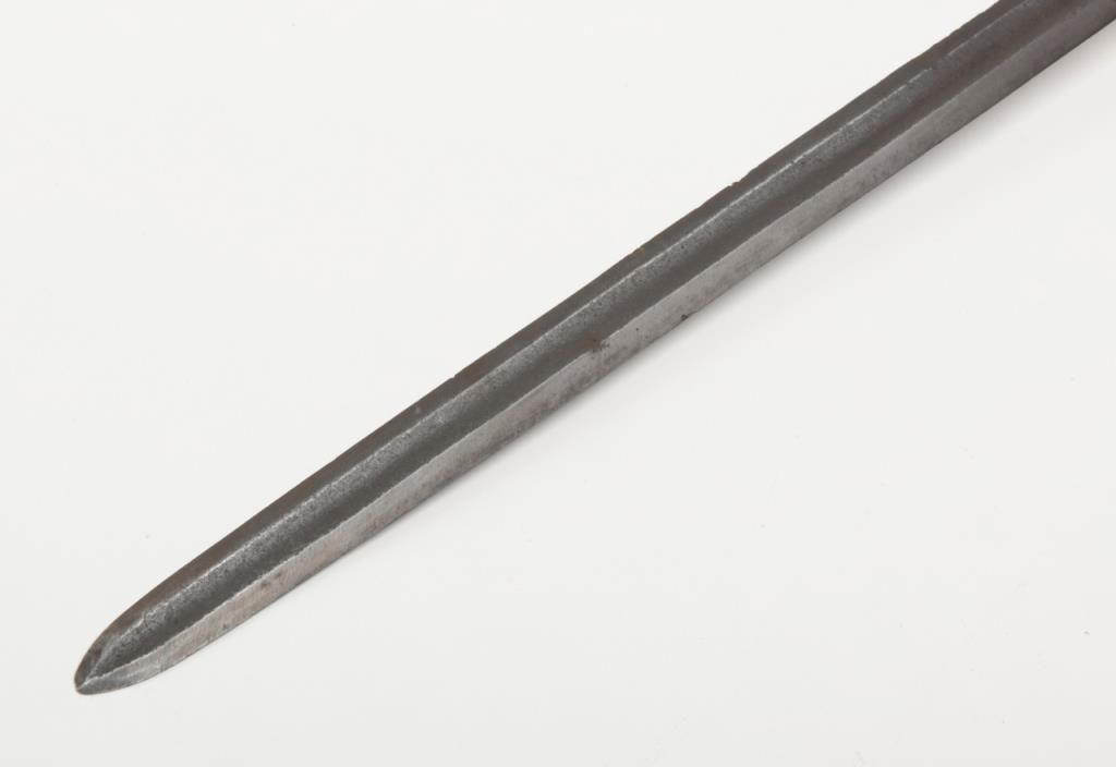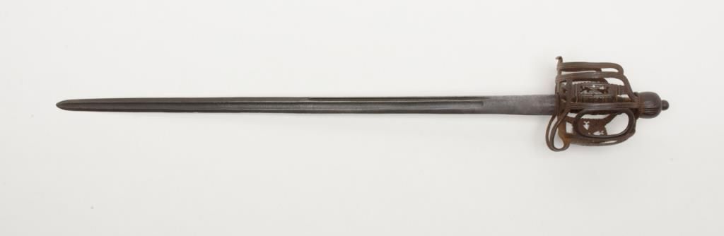 Scottish basket hilt back sword circa 1760s of the type carried by Dragoon’s during the French and Indian war era. This sword measures 41” overall with a 34 ¼” blade. The blade and hilt show an un-cleaned and matching patina (The pommel nut has never been disturbed) with some scattered light to moderate erosion and pitting and a few nicks at the edge from battle. The leather grip is good with some small losses and normal aging and its original twisted wire wrap. The hilt shows goodquality piercing and forging and this is one of the most untouched and original 18th-century Scottish basket hilts we have catalogued in a long while. Many Scottish regiments served in The American Colonies and fought in the Revolutionarywar as well as the French and Indian war. Est.: $3000-$6000