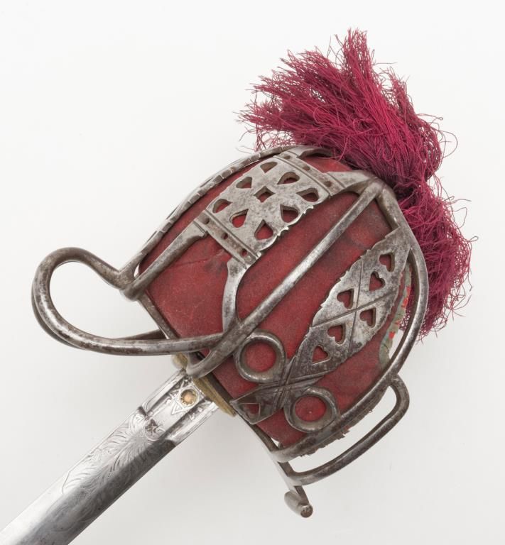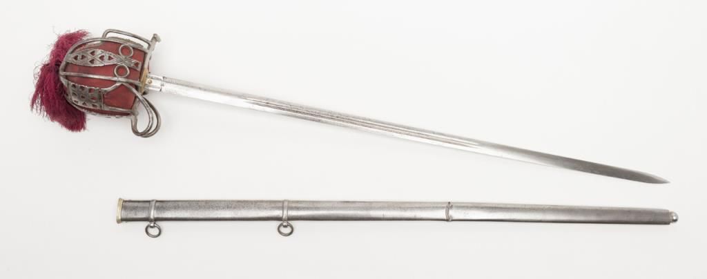 Scottish basket hilt military style saber with fancy etched blade marked Marshall and Company St. James Street, London with crest of Queen Victoria and unit marking for Borderers 90th light infantry. Condition is good to very good withoriginal scabbard. An attractive late 19 century Scottish basket hilt with interesting unit marking. Est.: $750-$1500