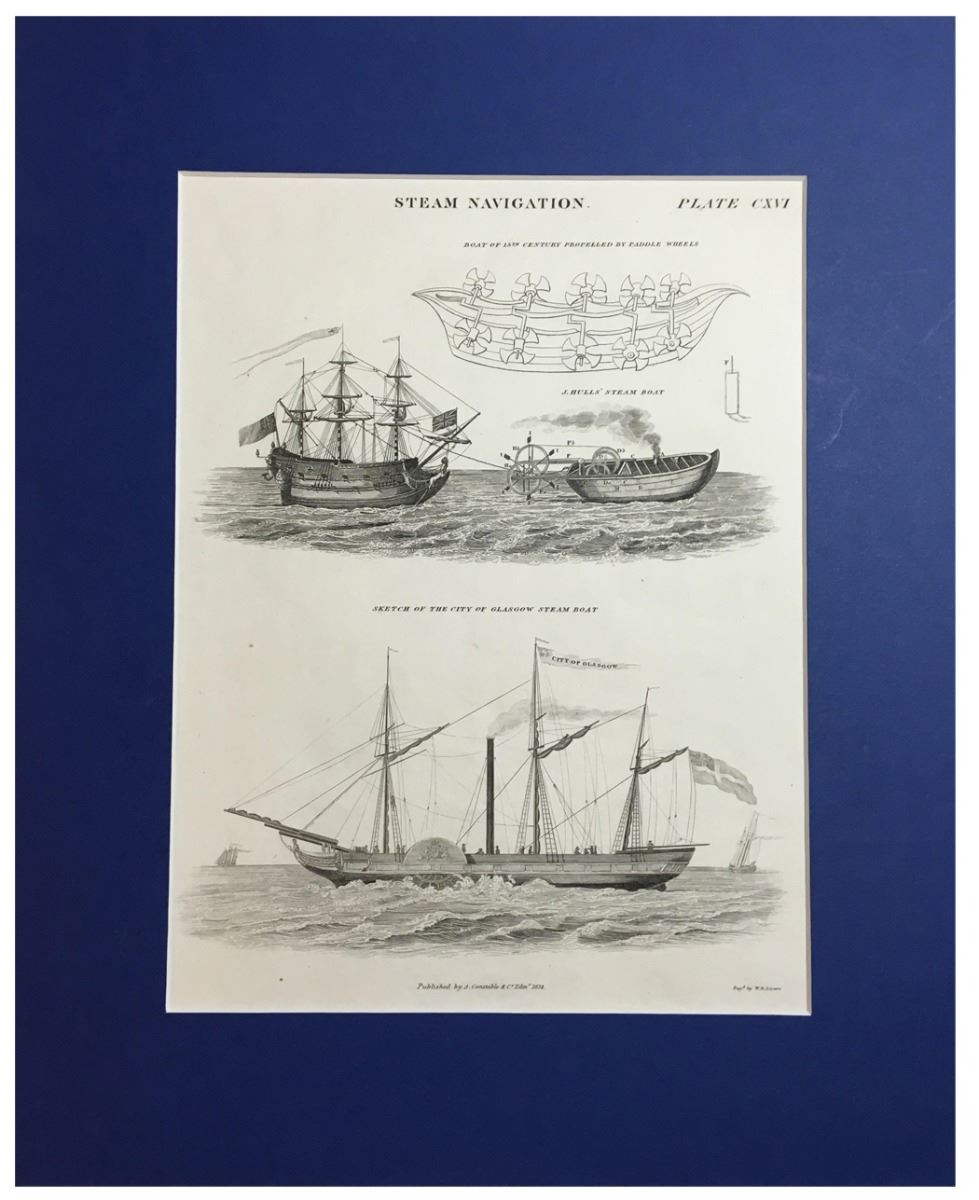 Scottish copperplate engraving by W.H. Lizars entitled "STEAM NAVIGATION" (Plate CXVI), printed in Edinburgh by A. Constable & Co. in 1824, showing side views of steam-driven wooden sailing vessels, including the City of Glasgow, matted for framing (blue). 13-1/2" x 11-1/4" (image size 9-1/2" x 9"). Highly detailed images of two ships, the one on top being towed by a steam-driven paddle-boat ("J. Hulls' steam boat"), in excellent undamaged condition.