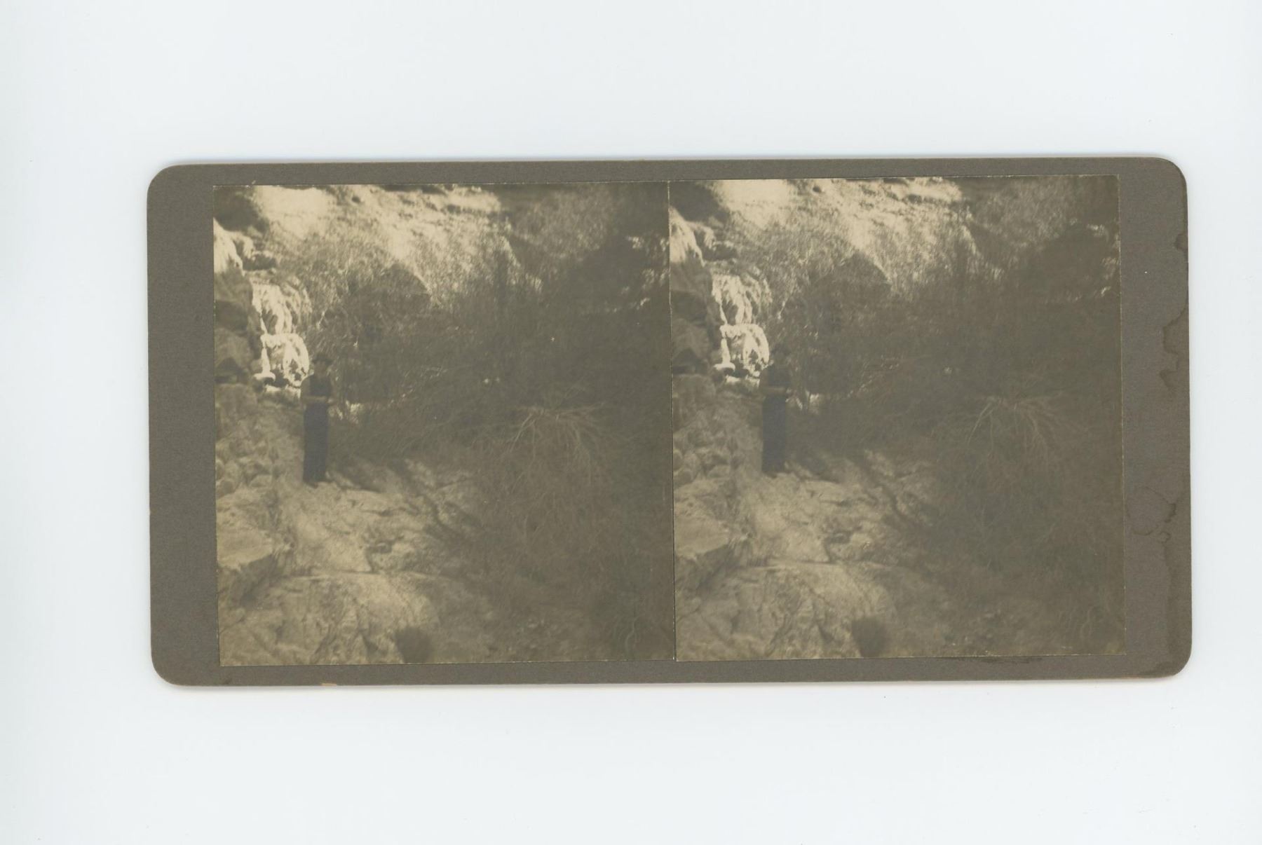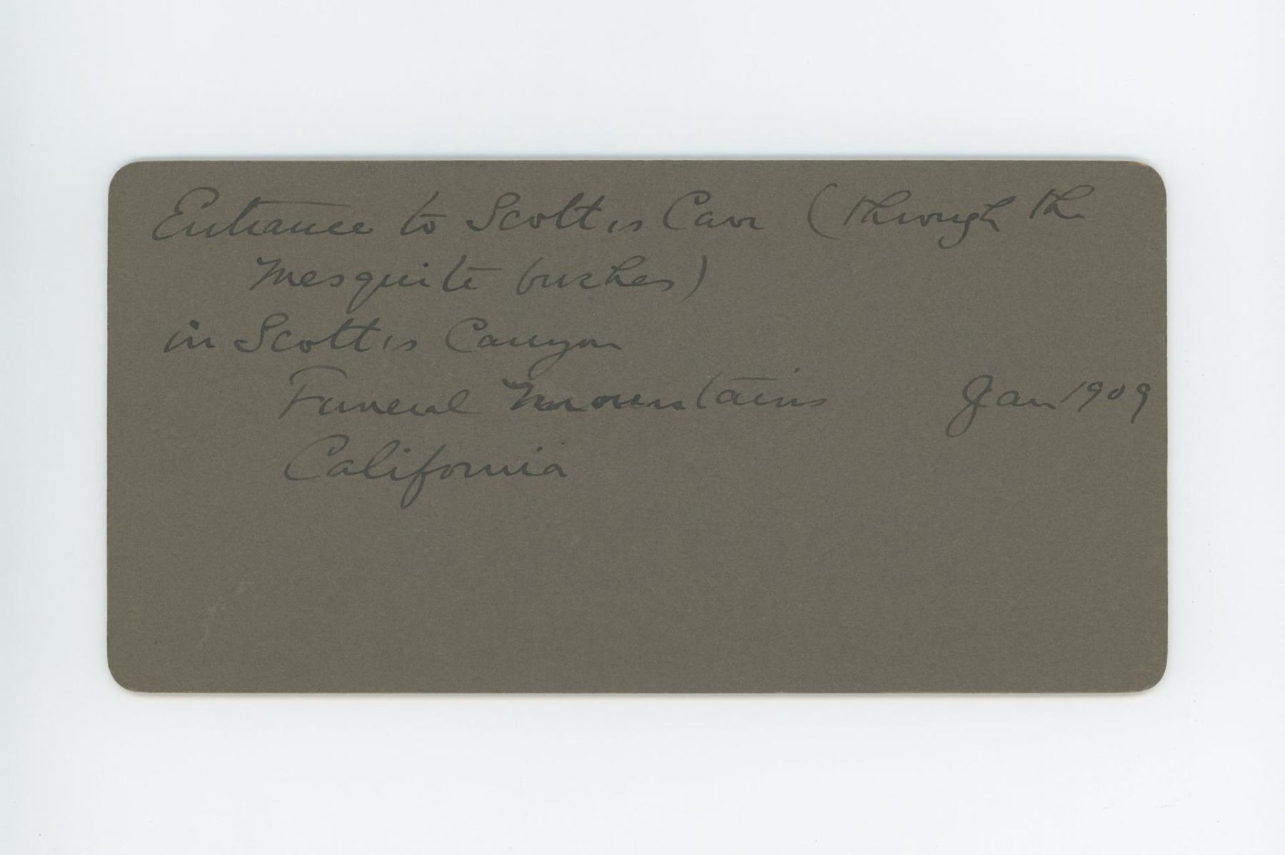 Entrance to Scotts Cave (Through the Mesquite bushes) in Scott's Canyon Funeral Mountains California January 1909