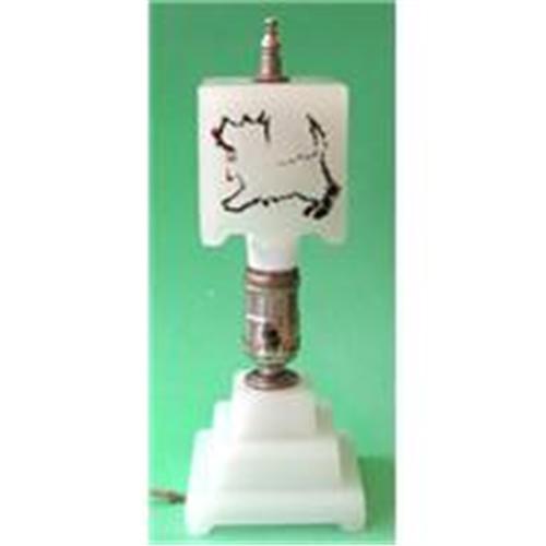 <tr><td>Title:Scotty Dog Art Deco Stepped Milk Glass Lamp</td></tr>