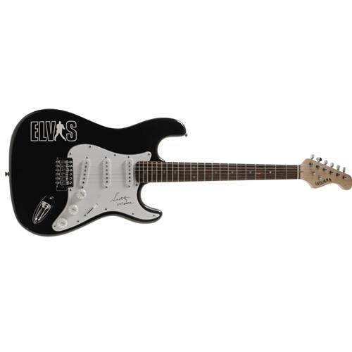 <B>Scotty Moore Autographed Guitar.</B></I> A black Indiana six-string electric guitar with Elvis logo, signed his former guitarist in black marker on the pick guard. In Excellent condition.<BR><BR><b>Shipping:</b> Musical Instruments, Large (<a target="_blank" href="http://www.heritageauctions.com/common/shipping.php">view shipping information</a>)
