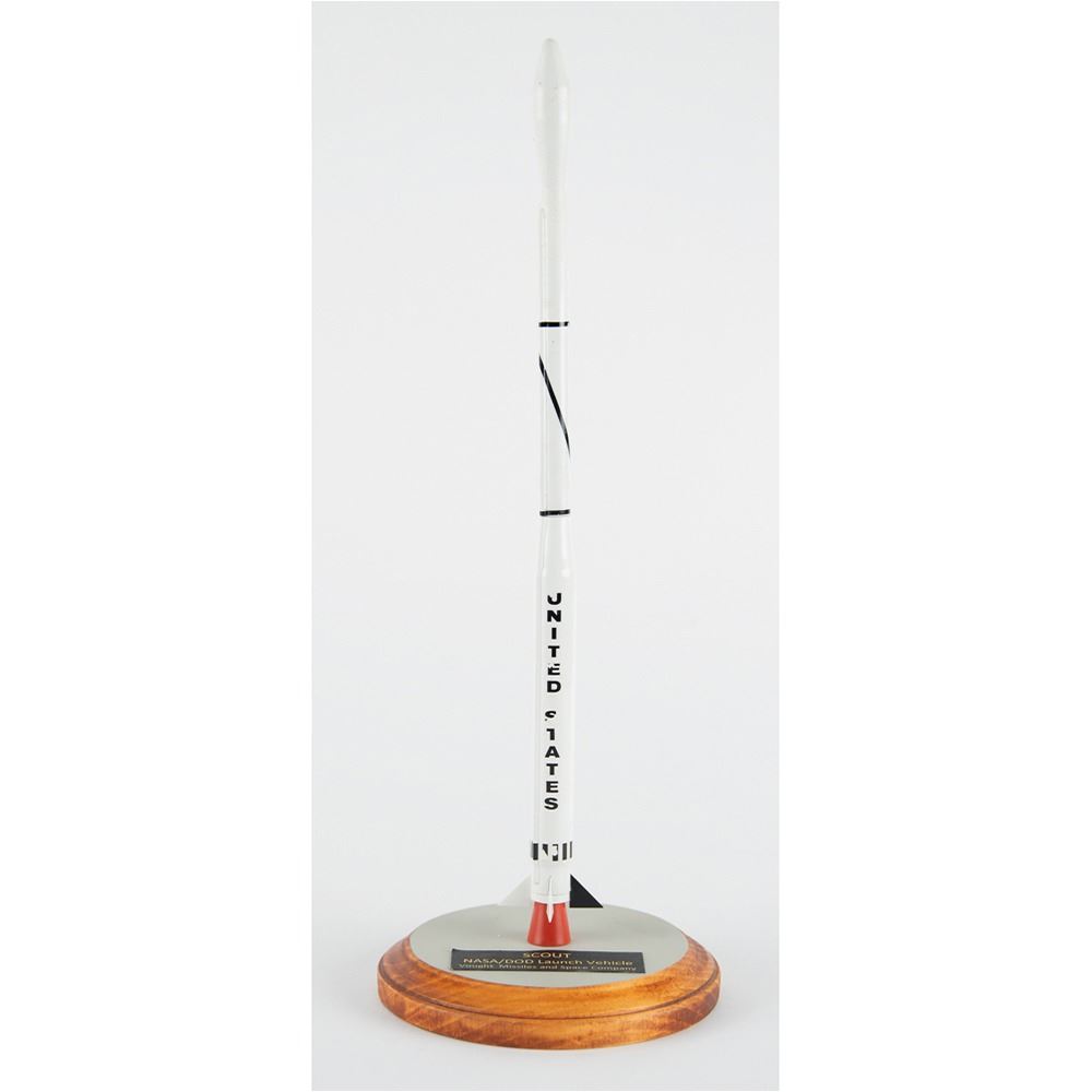 Appealing desk model of the Scout rocket, measuring 13Ë tall and set upon a 5Ë diameter wooden base, labeled: "SCOUT, NASA/DOD Launch Vehicle, Vought Missiles and Space Company." In fine condition.