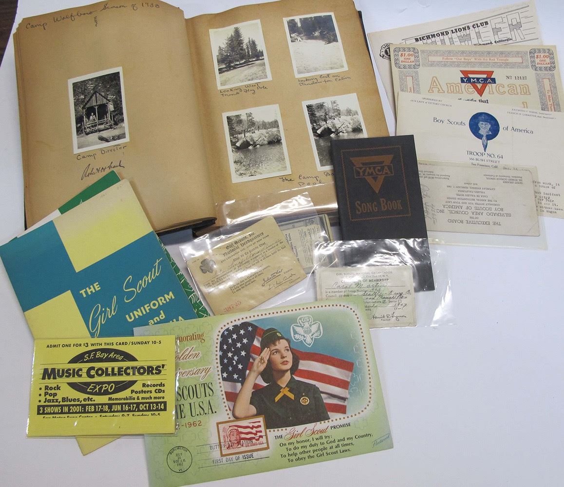 Assorted pamphlets and a scrap book with many pictures of Boy Scouts and Girl Scouts including 1) scrap book of pictures from 1938 of Camp Director at Camp Wolfboro(?), Camp Baxter on a river, charming photos of the boys "peeling spuds" and at the swimming hole and many newspaper article clippings 11.25 x 9.5"; 2) YMCA Song Book, 46 pp. includes songs I Love You California; Old Folks at Home; Mother Leary's Cow and many more old time songs 6.75" x 3.25"; One of the Song Books has some pages that are stained. This assortment has a Girl Scout Uniform and Insignia pamphlet and much more! Date: 1917-1960's Location: Bay Area, California HWAC # 54275