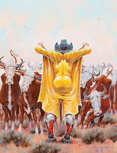 Mike Scovel’s caricatures of what Ed Trumble calls “ornery, sweet, cantankerous, bashful, careworn cowboys” have appeared on Leanin’ Tree cards for over twenty-five years. Despite the whimsicality of some of his his subject matter, Scovel is an accomplished artist who also sculpts and paints. Along with Bonnie Shields and Boots Reynolds, Mike Scovel formed Cowboy Cartoonists International in 1992. CCI now has twenty members and the organization mounts several group exhibits every year.
