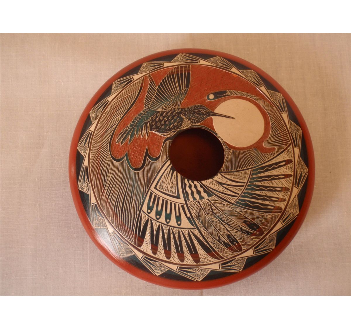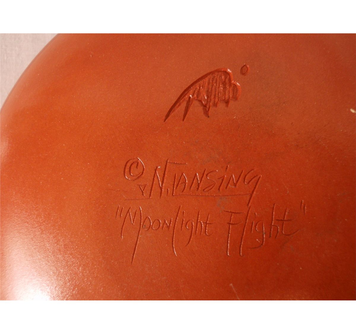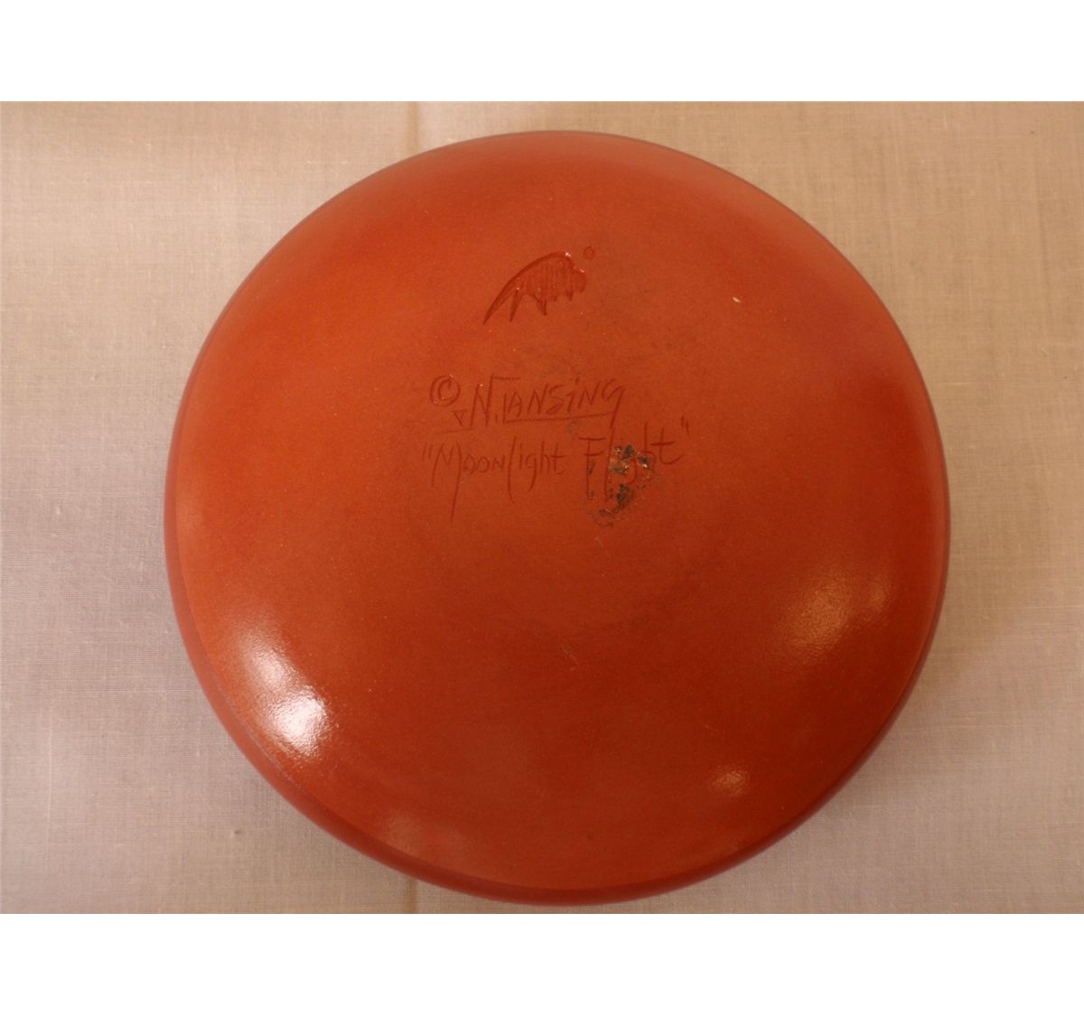 Beautifully Scrafittoed and hand painted green ware seed pot. Signed. N. Lansing. Titled "Moonlight Flight." Measures: 5 1/2" 1 3/4" Shipping on this lot: $10.00. Additional Shipping Charges for Lots sent outside of the U.S