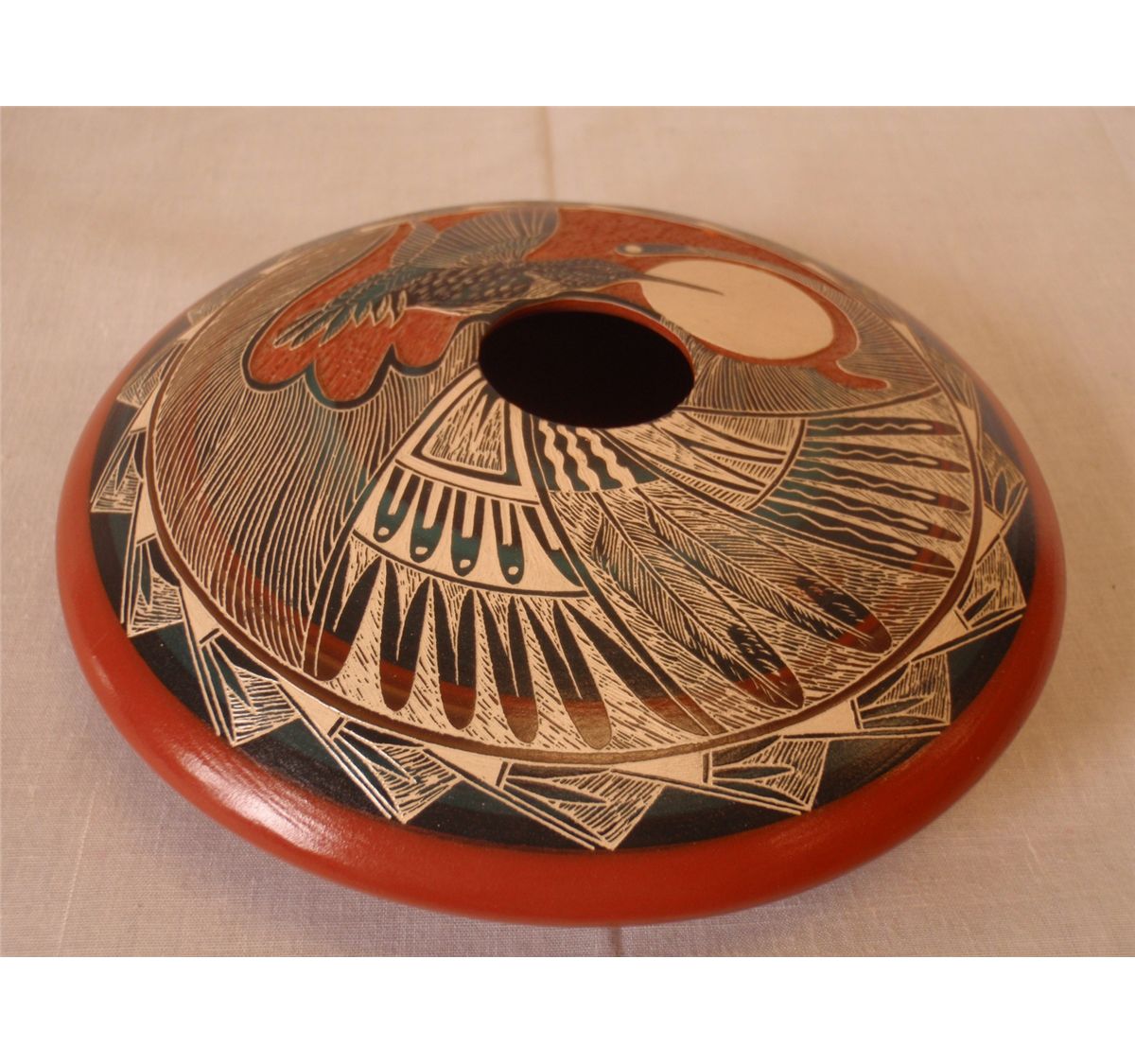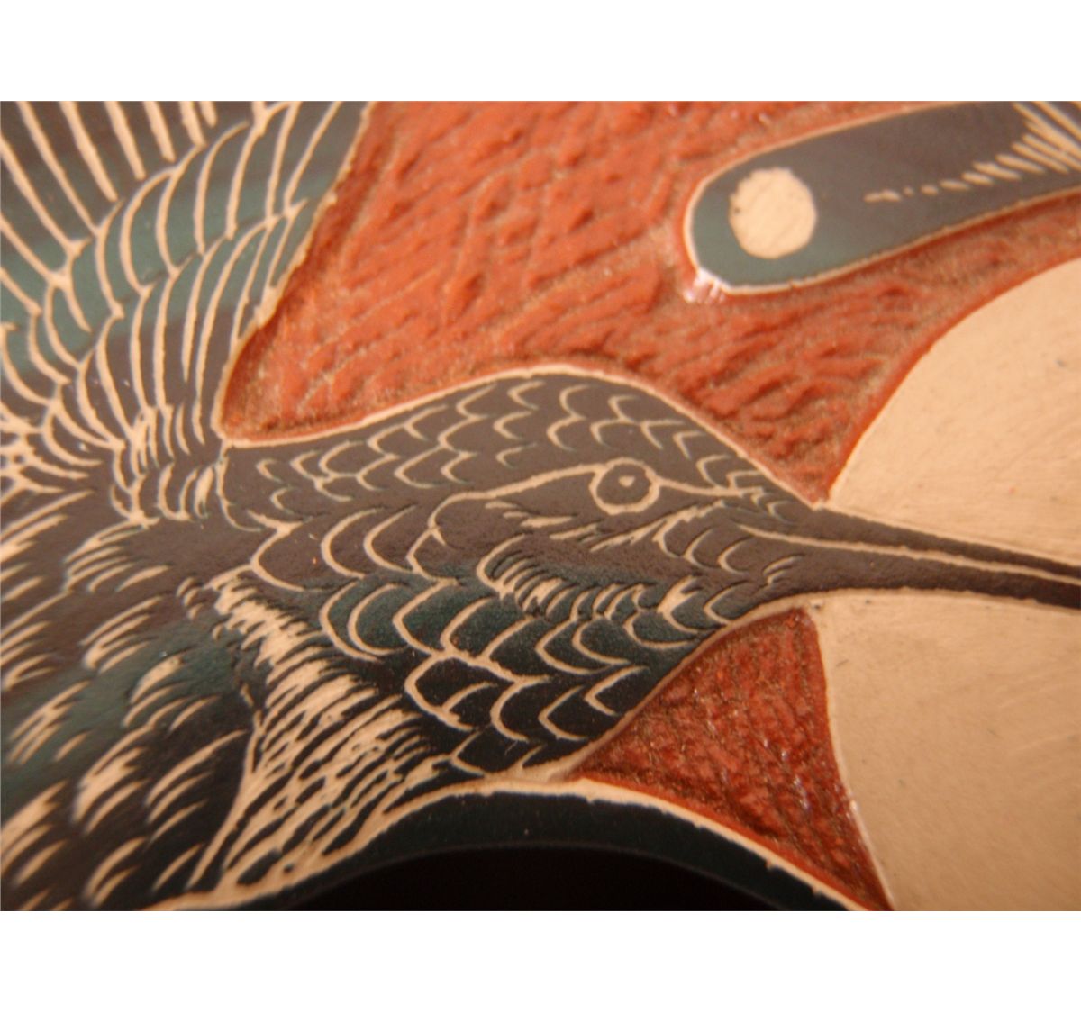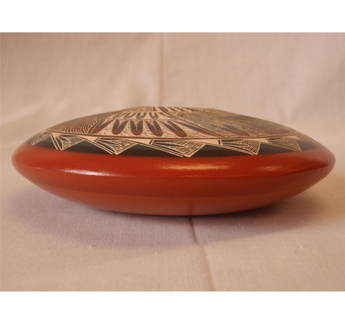 Beautifully Scrafittoed and hand painted green ware seed pot. Signed. N. Lansing. Titled "Moonlight Flight." Measures: 5 1/2" 1 3/4" Shipping on this lot: $10.00. Additional Shipping Charges for Lots sent outside of the U.S