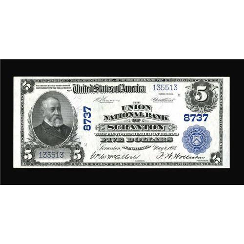 <B>Scranton, PA</B></I> - $5 1902 Plain Back Fr. 601 <B>The Union NB</B></I> Ch. # 8737<BR>This picture perfect <B>Extremely Fine</B></I> exhibits some remaining embossing and bold color.<BR><BR><b>Shipping:</b> Coins & Currency (<a target="_blank" href="http://www.heritageauctions.com/common/shipping.php">view shipping information</a>)