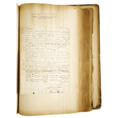 <B>Scrapbook of Original Historical Documents Pertaining to Providence, Rhode Island, 1690s-1820s</B></I>, 277 pages, remnants of brown-leather spine and corners, marbled boards, folio (12.5” x 18”). This is a ledger that was used as a scrapbook. It was compiled by a Providence family named Chaffee, and includes a handwritten (pencil) introductory description by Samuel Roscoe Chaffee, dated June 15, 1905, explaining in part, <I>“The old documents pasted in this book were found at my grandmother Nancy Chaffee’s death in 1874”.</B></I> The original handwritten and partly printed documents pertain primarily to land and property ownership, and include deeds, petitions, land records, inventories, bonds, bills, receipts, vouchers, statements, notices, leases, guardianship grants, military commissions, warrants, and school records. The ledger is in poor-fair condition: the front cover has been re-attached with book tape, and the back cover is detached; the marbled boards have considerable wear; the pages are in good condition; the attached documents vary from poor to good condition with staining and acidification.<BR><BR><b>Shipping:</b> Books & Catalogs (<a target="_blank" href="http://www.heritageauctions.com/common/shipping.php">view shipping information</a>)