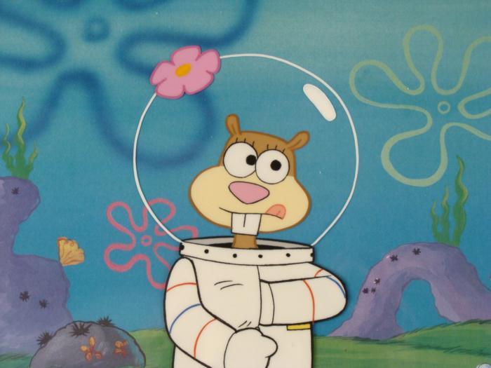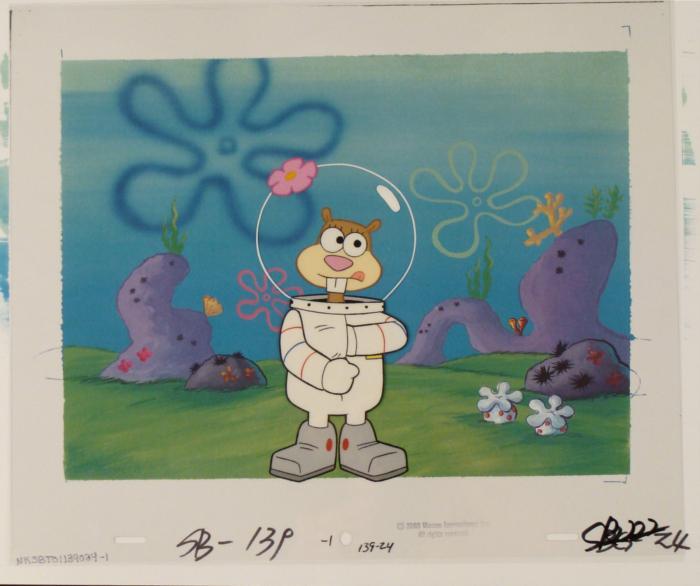 This animation cel and reproduction background are from the Nickelodeon TV show SpongeBob Squarepants. The story takes place under the deep blue sea in Bikini Bottom, where SpongeBob resides. SpongeBob, who is a yellow, porous sponge, is your typical happy-go-lucky character, as he is always cheerful and enjoys making people laugh. Patrick Star, SpongeBob's neighbor who is a starfish, is your average children's show idiot, as he boasts knowing nothing and is often getting himself into ridiculous situations. Between the homes of these two lies the home of the miserable Squidward, a squid, who is known for being grouchy and playing tricks on SpongeBob and Patrick. Both SpongeBob and Squidward work at the Krusty Krab, a fast food business run by the greedy money-loving Mr. Krabs, a crab, the arch rival of the evil, possibly misunderstood, Plankton. Another neighbor, Sandy Cheeks, an athletic squirrel who normally wears an astronaut's space suit, was introduced in "Tea at the Treedome." She spends most of her time inventing and experimenting. It seems like Sandy is scratching herself.Original Printed Background and Animated Cel Overall Size of Background: 10 1/2" x 17" Overall Size of the Cel: 10 1/2" x 12 1/2" Very good condition This is an original hand-painted cel set-up used in the production of an episode of "SpongeBob SquarePants." Each one-of-a-kind set-up represents a slight change in position of the characters. When individually photographed and projected in rapid succession, the images appear to move.