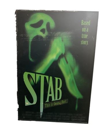 SCREAM 3 - “Stab” Framed Movie Poster - This 27 1/4” x 40 1/2” black frame displays a colorful movie poster for the fake film “Stab,” which actually “premiered” in the earlier “Scream 2!” The word “Stab” is printed in green letters with a knife-shaped “T,” with the tagline “This is Gonna Hurt...” printed directly below. A blurry green “Ghostface” killer lurks in the background of the poster, raising his curved knife that is dripping blood. The words “Based on a True Story” are also printed in green in the upper right-hand corner. This poster was custom-made exclusively for the production of “Scream 3!” Don't pass up this intriguing and pristine piece of authentic MIRAMAX movie history!! This item is over-sized, shipping rates determined by the winner's zip code, please E-Mail for shipping rates before bidding!