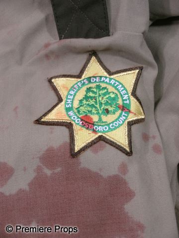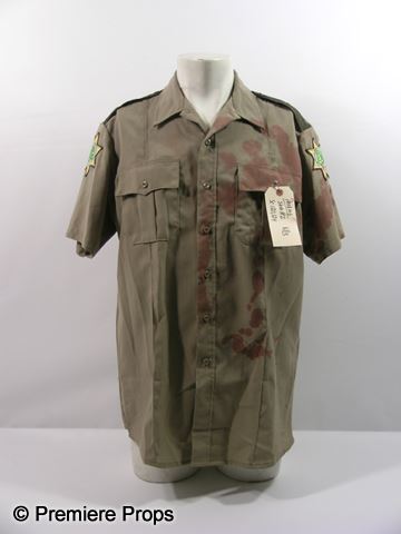 Deputy Perkins (Anthony Anderson) screen worn, bloody, khaki button up the front short sleeve with pockets on the front, 'Sheriff's Department Woodsboro County' patches on the sleeves "Blauer" uniform shirt.