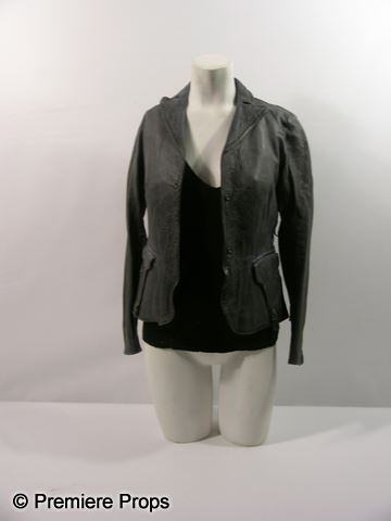 Gale Weathers-Riley (Courteney Cox) stunt, bloody, grey with two snap buttons on the front long sleeve with white stitching 'Blur' jacket, black deep scoop neck 'James Perse' tank top, and black 'Paige Denim' jeans. Includes wardrobe tag!