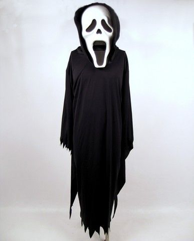 Ghostface Killer white and black styrofoam mascot style mask with hole on the top of the mouth with black hood, (approx. 16" long) and black robe with tie in the back, frayed at the bottom.