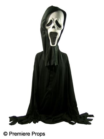 Ghostface Killer's screen worn black robe frayed at the bottom with built in hands and winged custom made robe, and white styrofoam with mesh mouth and padded hood with velcro, head strap inside, signature Ghostface Killer head/face. (no size on the robe and the head is 16" long)