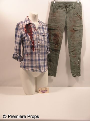 Jill Roberts (Emma Roberts) screen worn, bloody, white and purple plaid button up the front long sleeve 'Abercrombie' shirt, and faded green with cargo pockets 'J. Brand' pants. Includes wardrobe tag!
