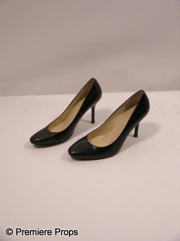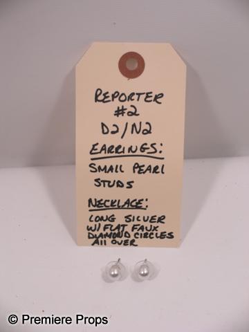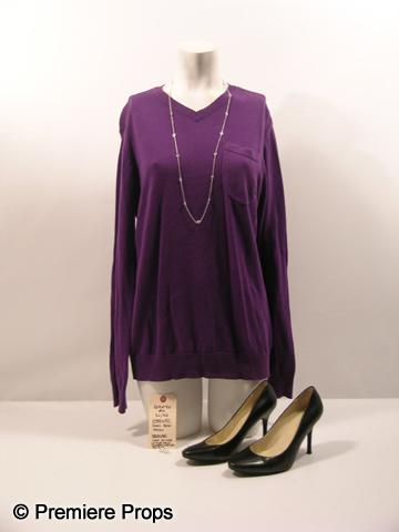 Scream 4 - Reporter #2 (Kim Adams) screen worn, purple long sleeve with small v-neck pocket on the front 'Emerica' sweater, long metal chain with sparkle stones, faux pearl earrings, and black leather 'Lauren' stiletto heels. (size 7 1/2) Includes wardrobe tag!