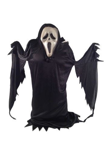 Ghostface Killer's off white plastic facemask with black border and elastic strap, black custom made hooded robe frayed at the bottom with built in winged hands, screen used by extra characters. There is a 4" tear on the left shoulder. (mask 14.5"x8")