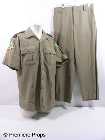 Sheriff Dewey Riley (David Arquette) screen worn, khaki button up the front short sleeve with pockets on the front, 'Sheriff's Department Woodsboro County' patches on the sleeves "Blauer" uniform shirt, and khaki with brown striping 'Blauer' uniform pants.