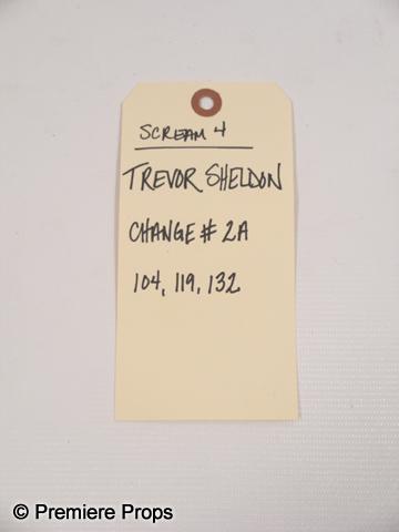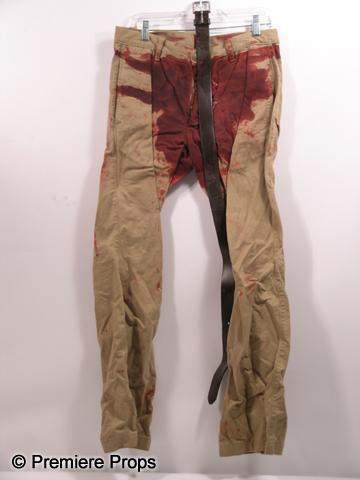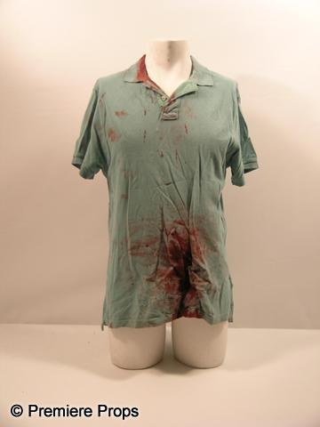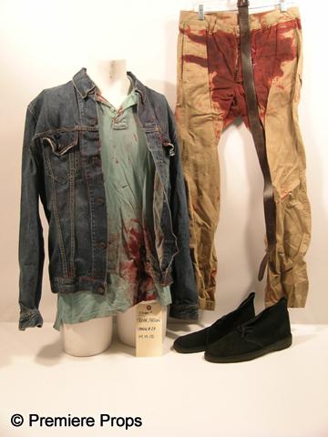 Scream 4 - Trevor Sheldon (Nico Tortorella) screen worn, bloody, medium blue denim button up the front long sleeve with front pockets 'Levis' jacket, green short sleeve with collar 'J. Crew' polo shirt, (size M) khaki straight leg 'The Original Khaki' pants, (size 31x32) brown leather belt, and black lace up the front 'Clarks' boots. (size 10 1/2) Includes wardrobe tag!