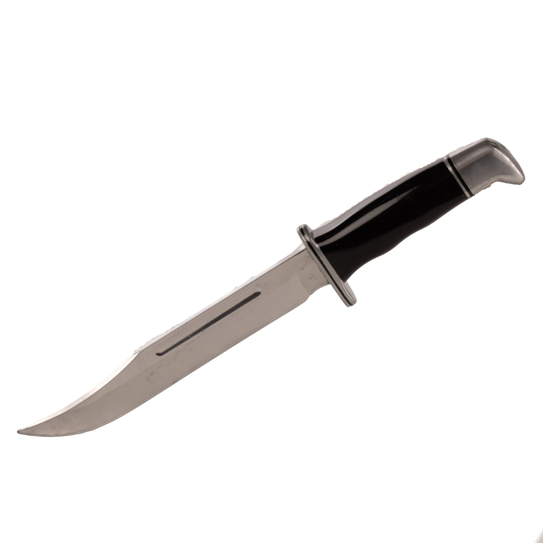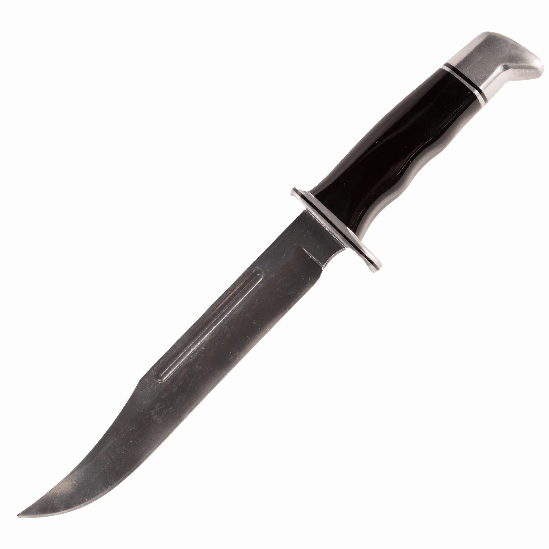 Crafted as a rubber cast from a modified Buck 120 Hunting Knife, this prop knife features distinct elements, including a clip-point blade painted in a semi-reflective metallic silver, a small guard, and a handle with finger grooves painted black with metallic silver detailing. This piece is accompanied by a Certificate of Authenticity from Studio Auctions.
