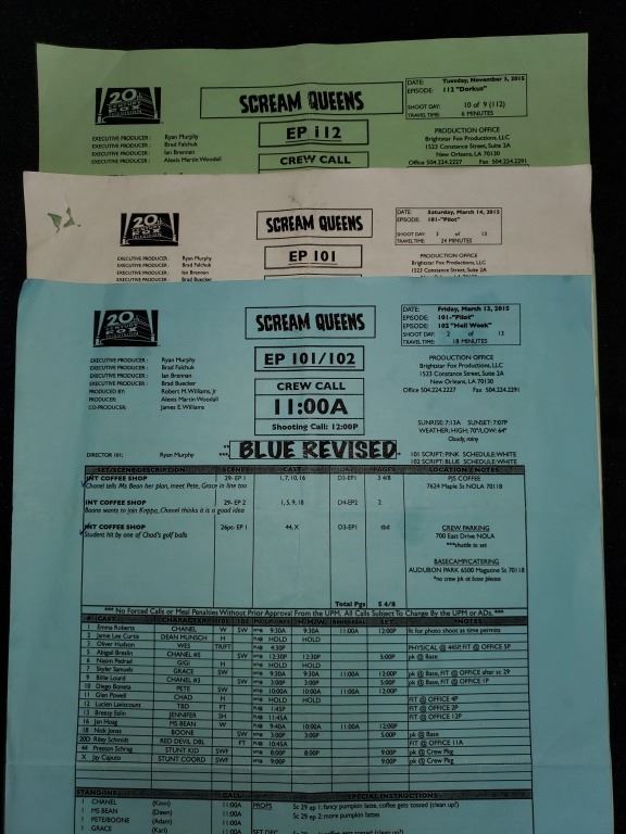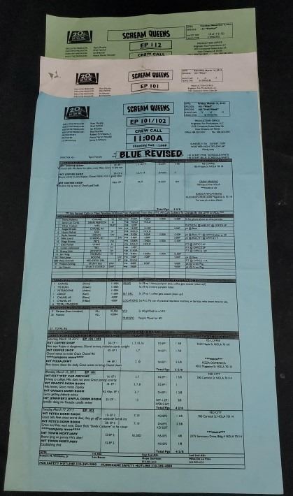 "Scream Queens" 2016 Call Sheet Starring Emma Robert's, Jamie Lee Curtis, Oliver Hudson