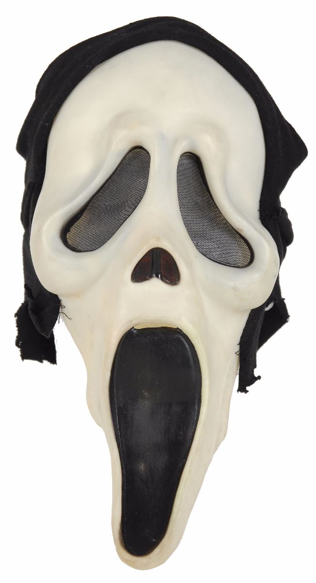 Iconic screen-used Ghostface mask from Wes Craven’s 1996 horror film Scream. One of the most recognizable mask designs in the horror film canon, this remarkable production example is comprised of rubber, black fabric, and black mesh for the eye holes. Of the many masks made for the film, this particular version was used when Drew Barrymore was strangled in the opening scene, with that same same shot also superimposed over Principal Himbry's eye as he died later in the movie; this exact mask can also be seen in the documentary Still Screaming. In fine condition. Accompanied by a letter of provenance, in full: “I certify that this is a genuine hero Ghostface mask from the film Scream. The fabric was removed by the prop department, for use on another mask. This mask was part of a lot of screen used masks obtained directly from the film’s property manager.” An incredible stage-used accessory from a film that not only reignited the teen-slasher phenomenon, but also inspired a whole new generation of trick-or-treaters.