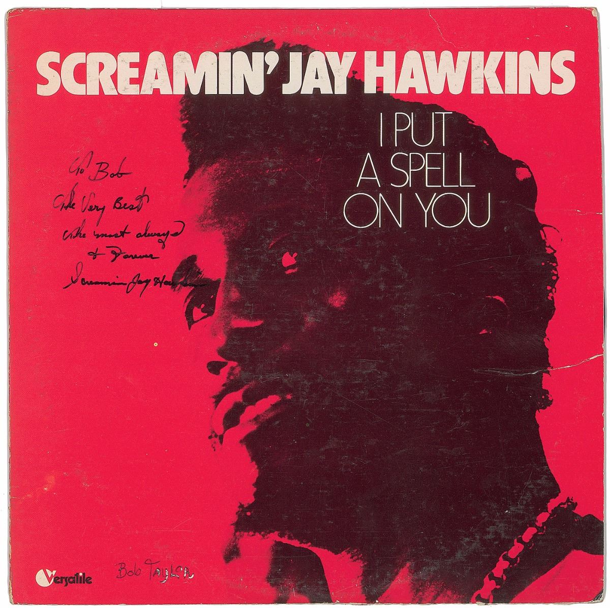 I Put a Spell On You album signed and inscribed on the front cover in black felt tip, “To Bob, the very best, the most always & forever, Screamin’ Jay Hawkins.” In very good to fine condition, with an ownership signature, and some creasing. The record is included.