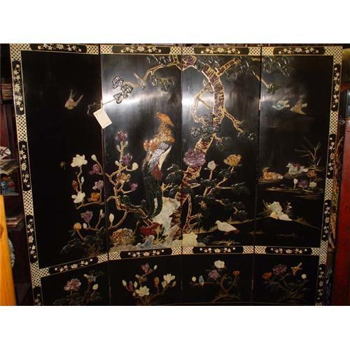 This is one set of four panel beautiful Chinese screen with hand-lacquered and made of havy, durable Elm wood. It features antique soapstone of birds and flowers.