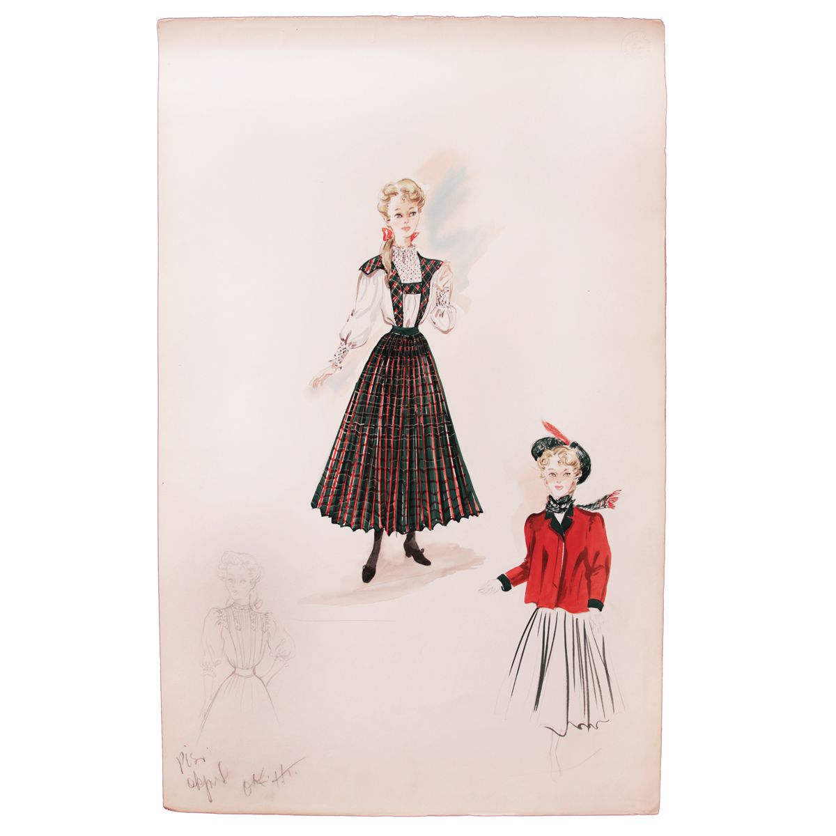 Excellent pencil and watercolor costume sketch of Mona Freeman for the 1951 comedic film ''Darling How Could You!'' in which the Paramount Pictures young starlet plays Amy Grey as the daughter of Joan Fontaine. Drawn by famed 8-time Academy Award winning costume designer Edith Head, with two sketches in watercolor and one in pencil on one piece of sketch paper. Sketch is unsigned by Head which is common for this era. Initialed and approved by directed Mitchell Leisen and producer Harry Tugend at lower left corner, with a cost breakdown of making the costumes on verso. Sketches are drawn on heavy watercolor paper measuring 14.5'' x 23'', with very minor toning along edges, else near fine.