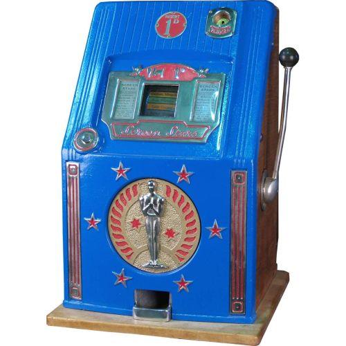 Screen Stars 1 Pence 3 reel Slot Machine shows American stars on reel strips - restored.