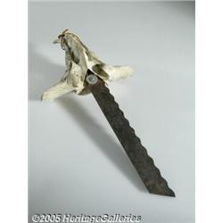 <B>Screen-Used Knife from "The Texas Chainsaw Massacre (Bryanston, 1974).</B></I> When you're a psychotic serial killer who dresses in the dead flesh of his victims, you can't just go and buy your killing knife from Home Depot. No, you deserve something special, like this hand-made, bone handled blade that was actually used in the production of Tobe Hooper's classic film, "The Texas Chainsaw Massacre." From the collection of Ed "The Hitchhiker" Neal, this chilling prop was created by Art Director Bob Burns. Part of a cache of props kept in a storage room in Austin, Texas, this knife and other items (including the Kitchen/Old Lady mask, the bone chair and the arm lamp offered separately in this catalog) were eventually sold to a furniture store when the owner tired of paying the storage fees. They were later acquired by Neal, who has graciously consigned them to this auction. The knife is in excellent condition, with a blade measuring approximately 9.5" x 1.25" and a handle measuring approximately 6.5" x 8", with a 2.5" diameter. This is more than just a cool knife, this is an important and historic piece of horror film history.