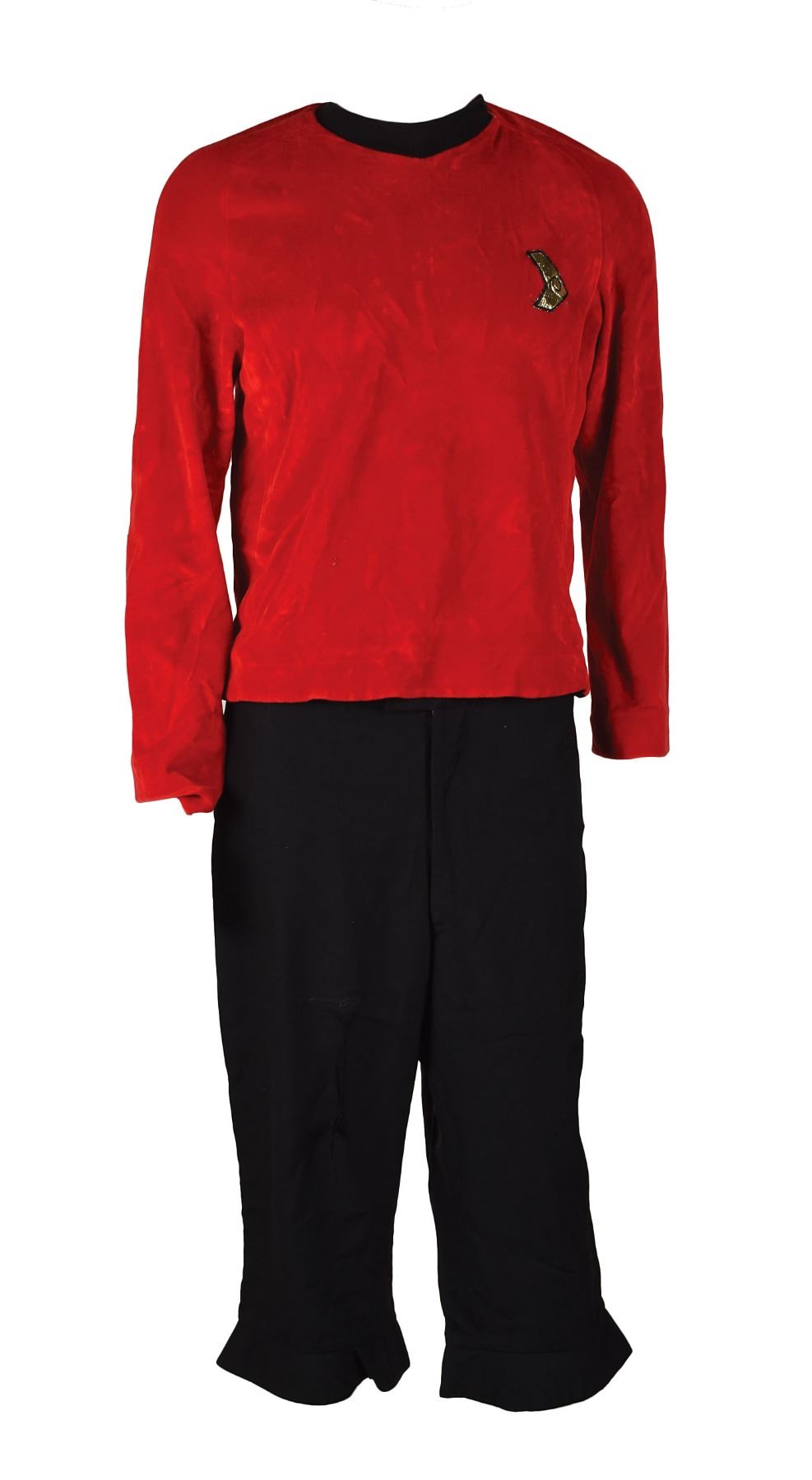 Desirable Starfleet uniform consisting of red shirt and black pants, worn on screen in the Star Trek: Deep Space Nine episode ‘Trials and Tribble-ations,’ Season 5, Episode 6, air date of November 4, 1996, and then later on in the Star Trek: Enterprise episode ‘In a Mirror, Darkly,’ Season 4, Episodes 18 and 19, air date of April 22 and 29, 2005. The velour engineering/security shirt with long sleeves and black collar features a gold USS Defiant patch attached to left chest, with the inner collar bearing an Enterprise tag and a Deep Space Nine tag, with the former annotated, “Todd Leatherbury.” The black cropped dress-style pants also bear Enterprise and Deep Space Nine tags, and are annotated: “Eric Warfield” and “Greg Redmond.” In fine condition. Provenance: 40 Years of Star Trek: The Collection, Lot 256, Christie’s, October 5–7, 2006. Accompanied by the original Christie’s catalog, with the pants bearing the corresponding Christie’s lot tag.