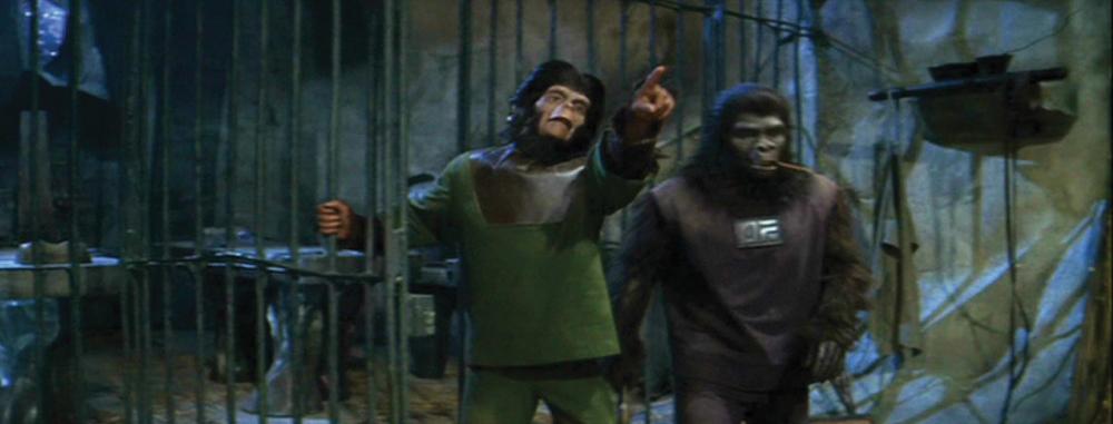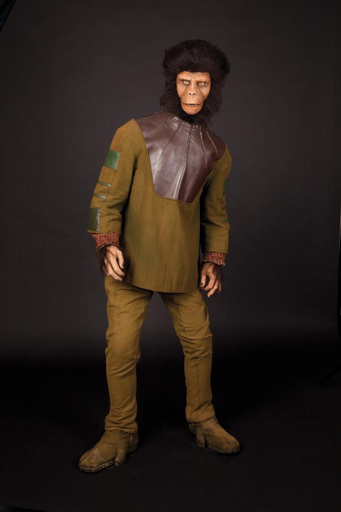 (TCF, 1968) This complete screen used male chimpanzee costume is mounted on a custom flexible mannequin boasting a stunning silicon head of Lisa’s husband, Caesar (made using appliances from Roddy McDowall's mold), prosthetics grade glass eyes and hand punched human hair. The costume was made originally for the classic Planet of the Apes and used subsequently in all the sequels and the TV series. It consists of a tunic with leather collar and leather arm accents, pants and the super-distinctive Apes shoes, which look like hands.