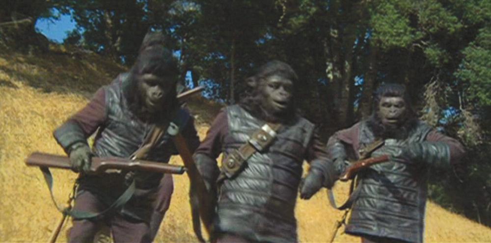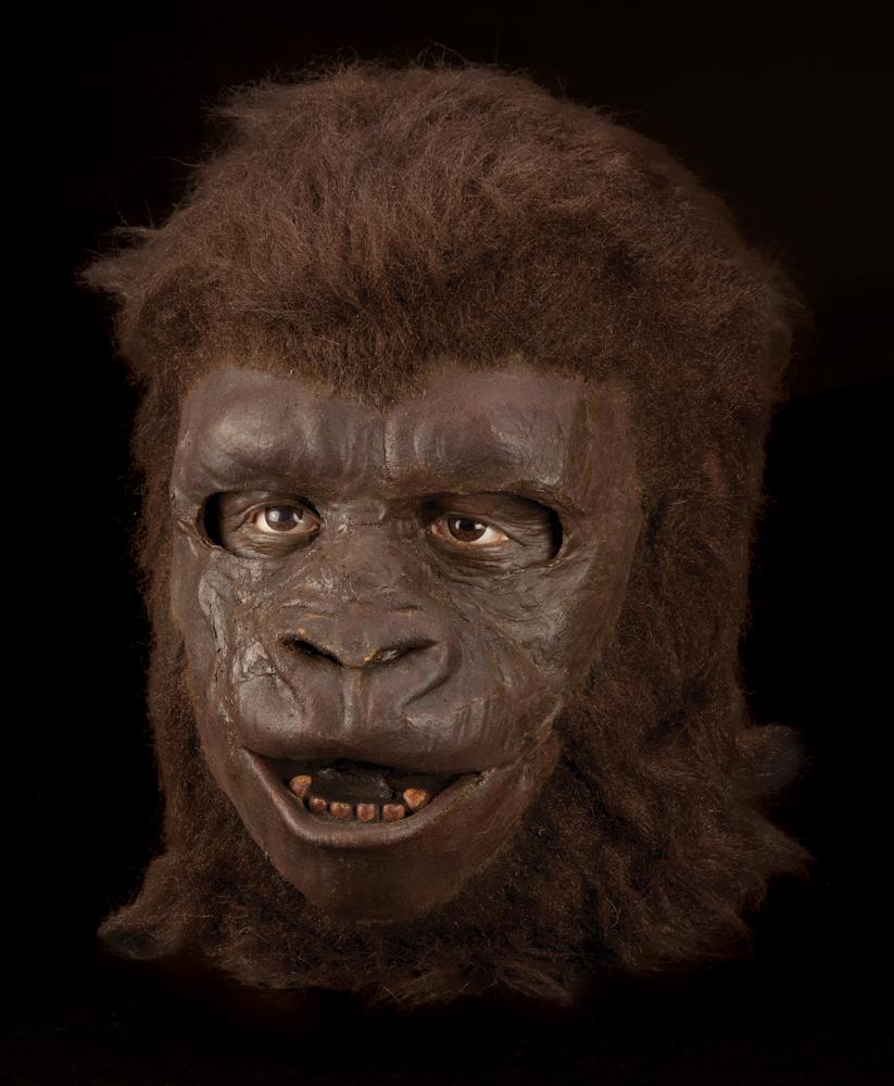 (TCF, 1968) This screen-worn background gorilla mask features prosthetic grade glass eyes and hand-punched human hair. It exhibits some restoration and stabilization and makes an excellent display.