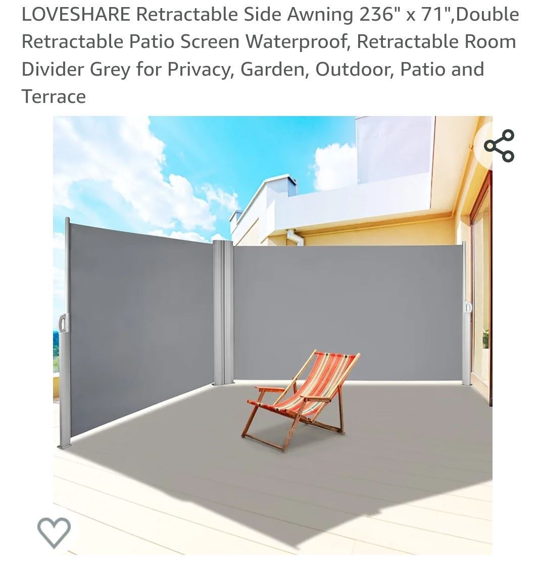 Waterproof patio screen, 236" wide by 71" high, ideal for garden, patio, and terrace privacy, this screen is new but has some dents on the ends of the roller frame, still looks good and works like it should really nice privacy screen