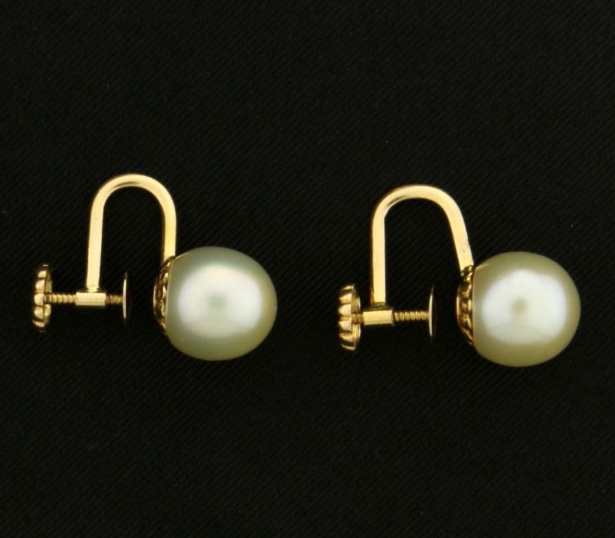In 14k yellow gold. Containing two 9mm high quality natural Akoya pearls with excellent color and luster. 3/4" long with screw backs for non-pierced ears. 3.2g.