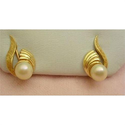 Beautiful Vintage Pearl Earrings with Swirl gold design. The 6mm Pearl tests genuine and the earring are marked 14K. They are 1/2" long and 3/16" wide and weigh 3.7 grams of gold. Nice florentined detail on the swirl to set off the high shine of the rest of the earring. Great for the lady who does not wear pierced earrings.