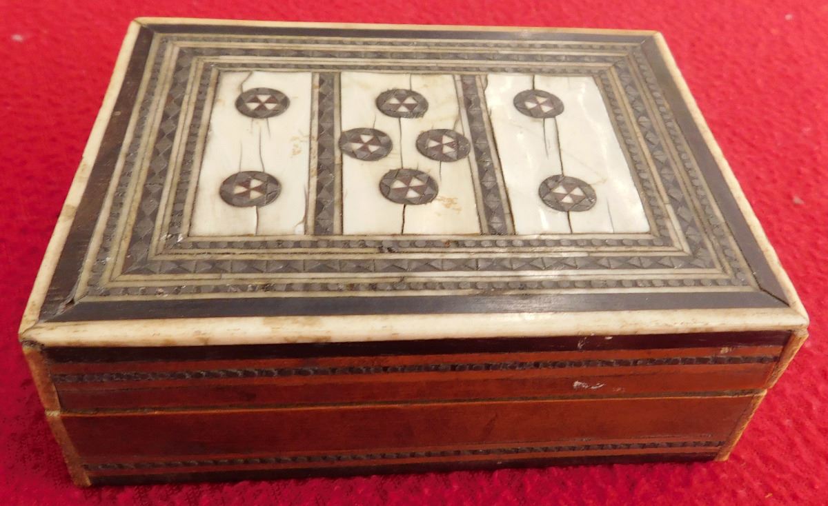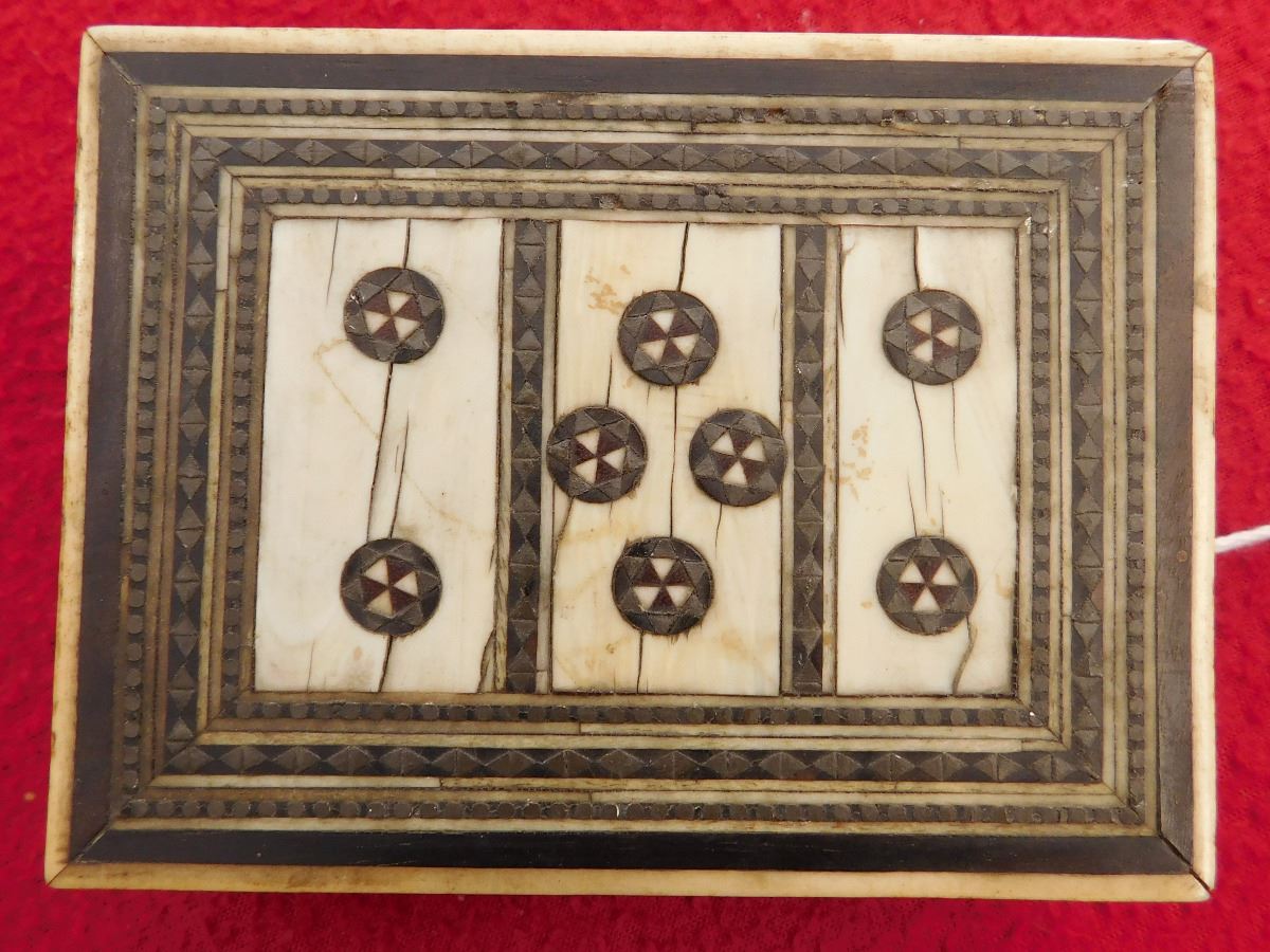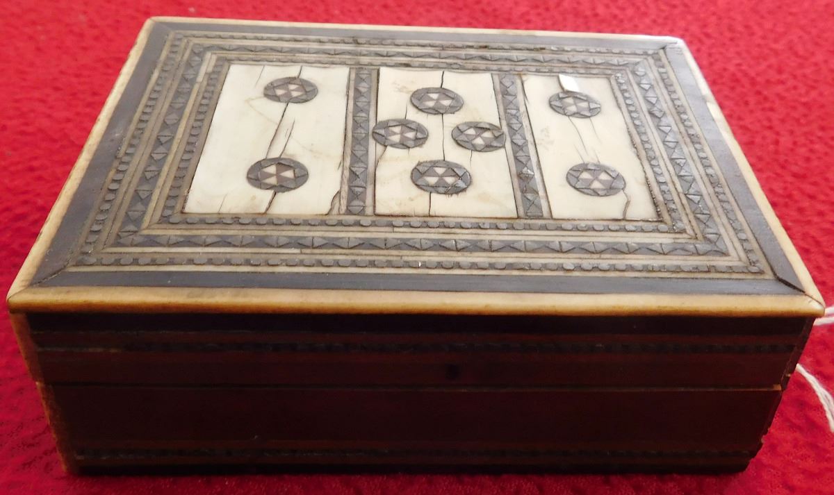 scrimshaw & Bone Inlaid Box, circa 1880s. Made of bone, teakwood and metal, the item measures 3 7/8" x 2 7/8" x 1 1/4. Alaska. Includes one old black and white domino. Condition: Good, minor scuffs, see images. Shipping: $18.50 w/insurance and signature.