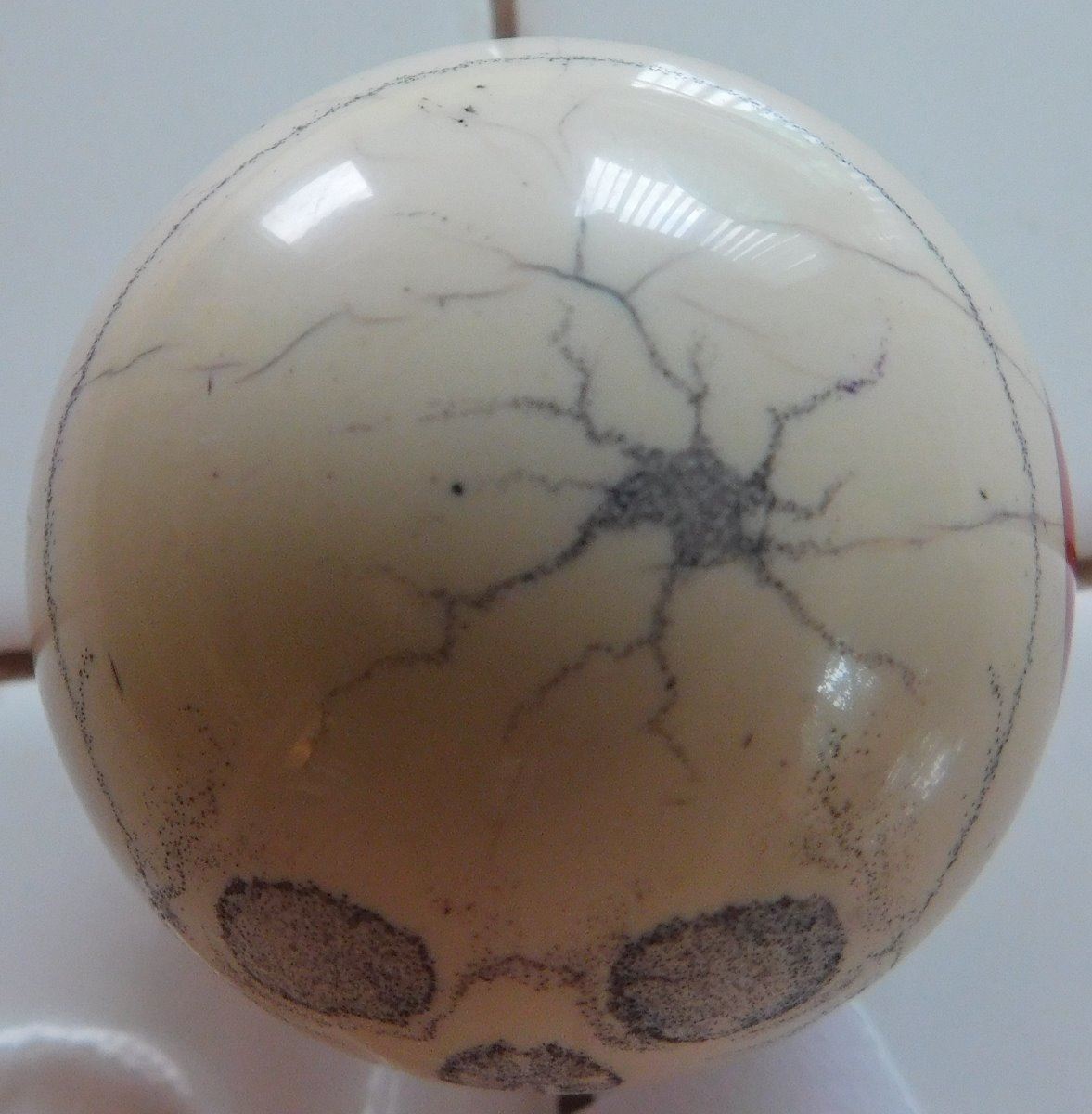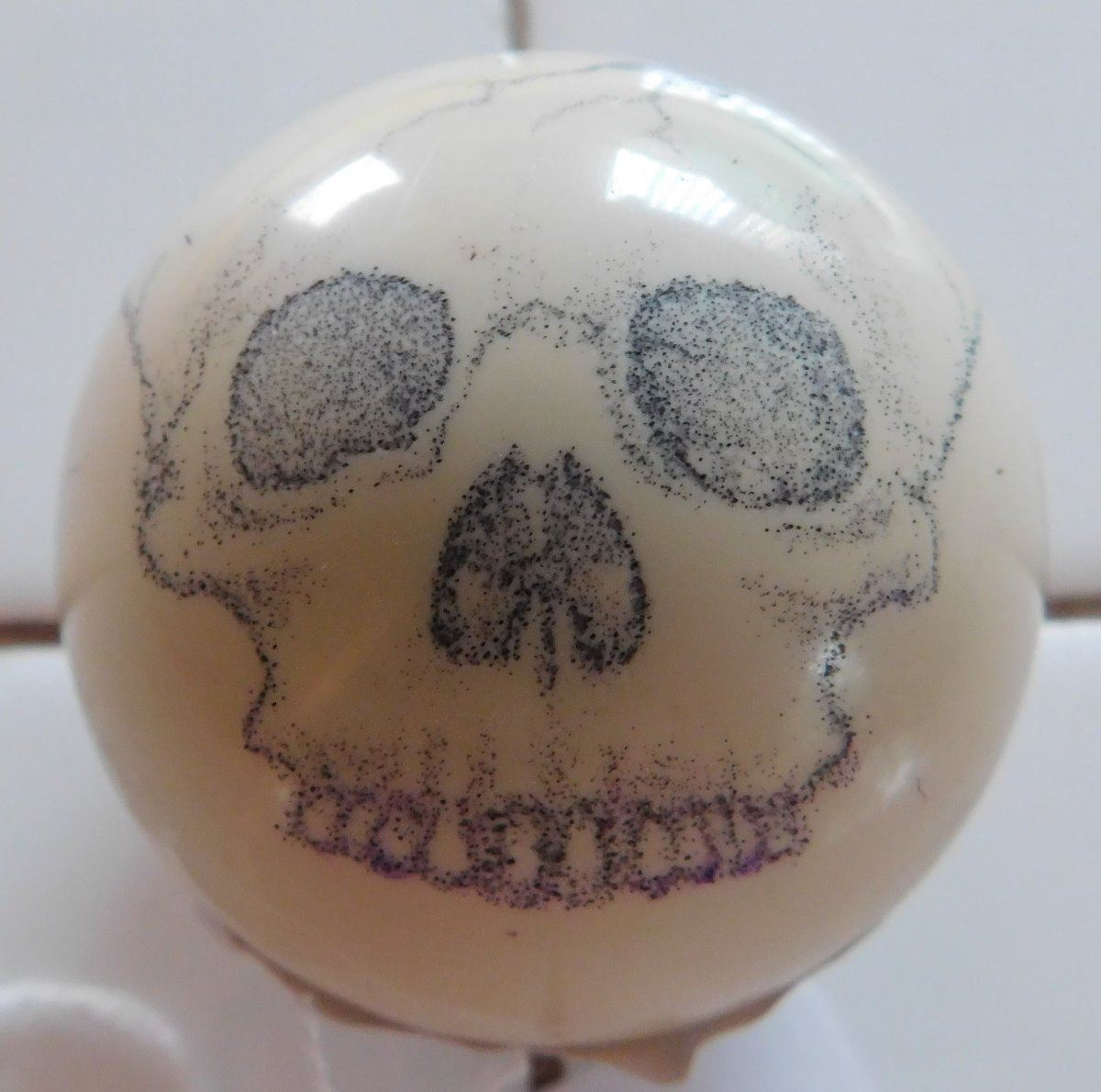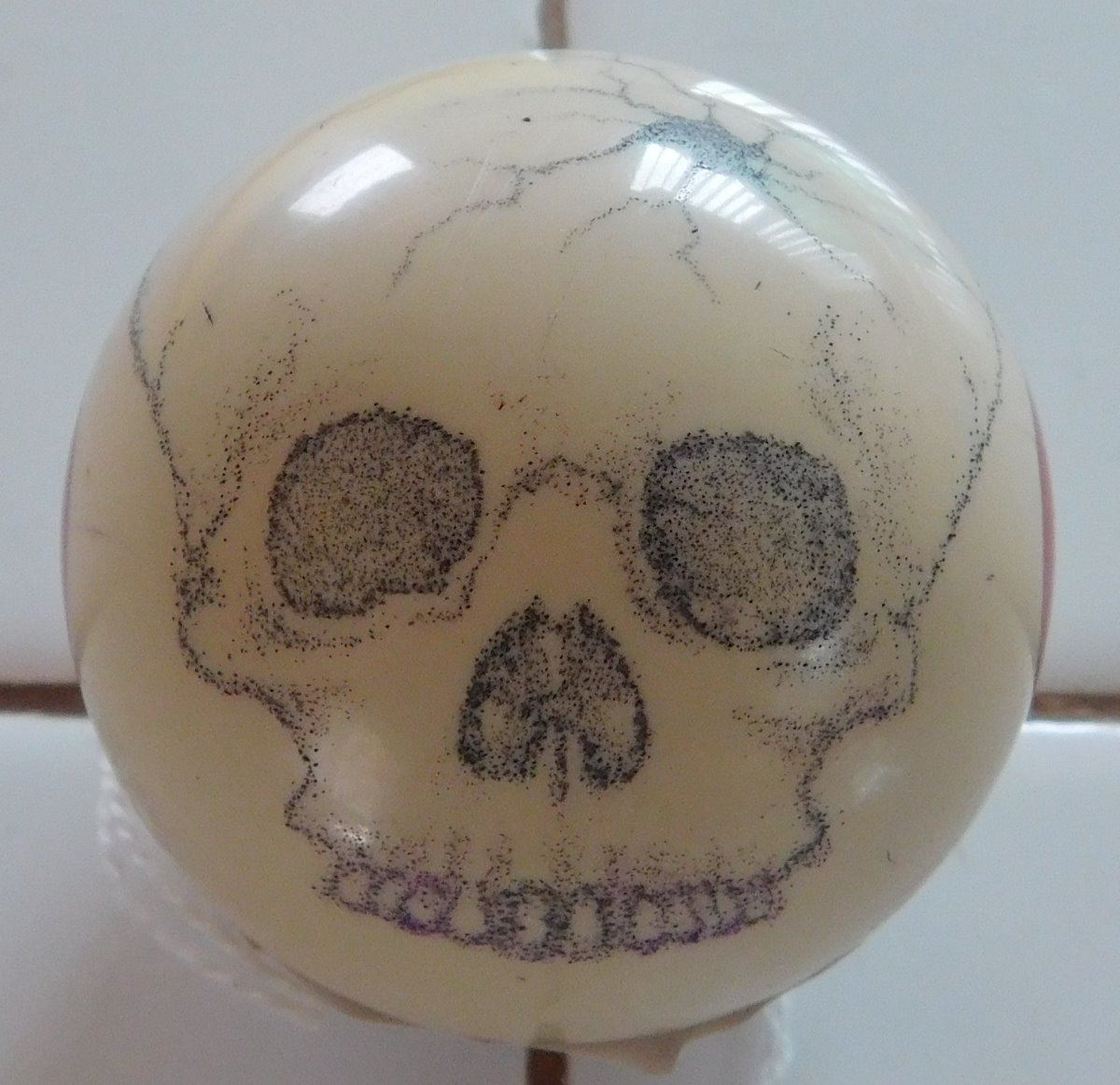 Scrimshaw Cue Ball, 20th century item. Made of plastic and measuring 2", original work by Steve Aho. Skull engraved on ball. Condition: Good, see images. Shipping: $15.50 w/insurance and signature.
