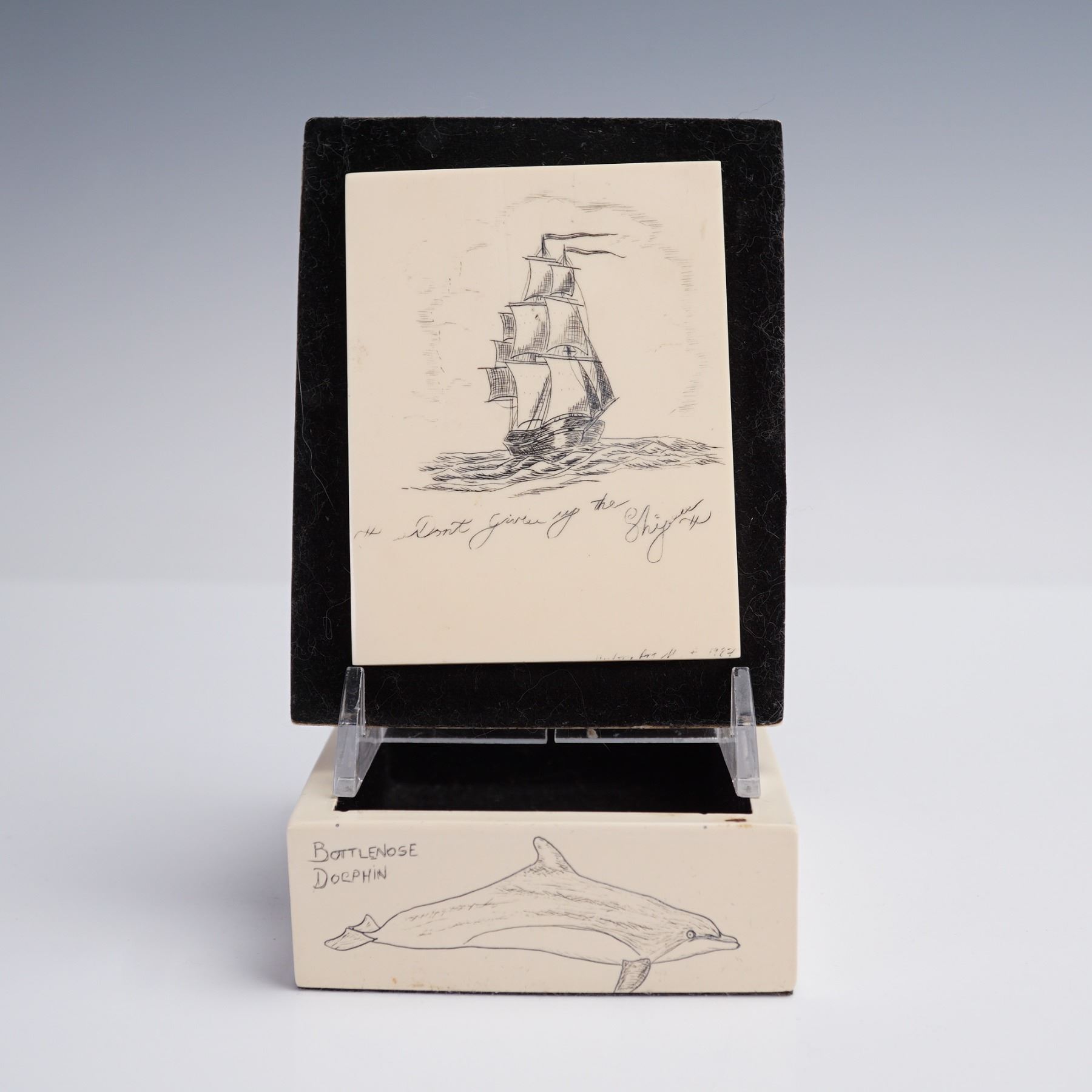 A finely crafted scrimshaw-style faux bone box featuring intricate hand-engraved depictions of marine life, including a Blue Whale, Sperm Whale, Black Right Whale, Bottlenose Dolphin, and Killer Whale. The lid showcases a compass rose surrounded by whale illustrations, while the interior includes a panel etched with a tall ship at sea inscribed with the phrase Don't Give Up the Ship. This nautical-inspired piece captures the artistry and tradition of maritime scrimshaw, presenting striking detail and a strong sense of seafaring heritage. A captivating decorative collectible that celebrates oceanic lore and craftsmanship.