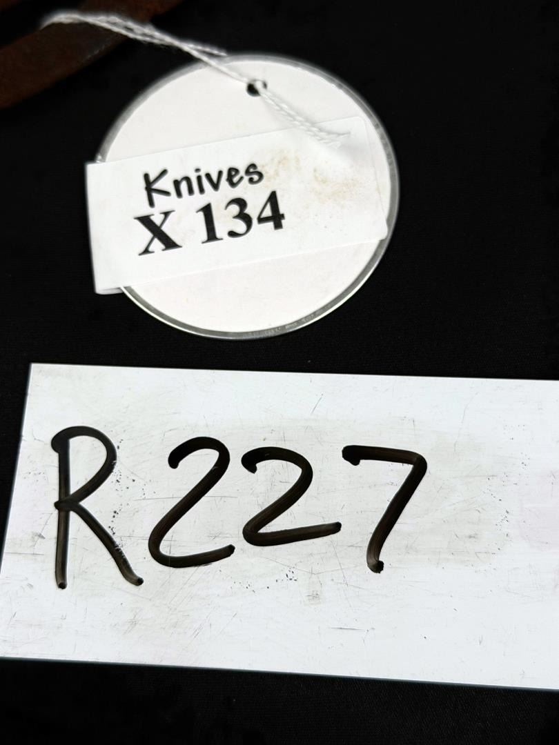 An early 19th century sheath knife, with saddle leather frontier-made sheath. Bone handle with brass hardware. The handle shows crude etching of a Native American holding a scalp. Knife is 11 1/2" overall with a 7 1/4" blade. From the Robert G. McCubbin Collection Provenance: Bob McCubbin collection, lot 611, Brian Lebel auction, Jan 26, 2019, $21,240.