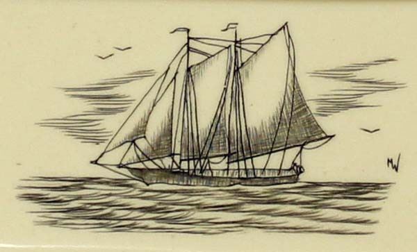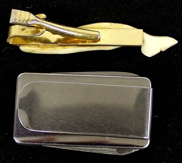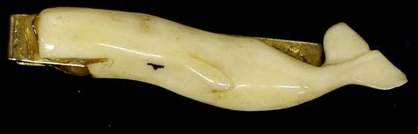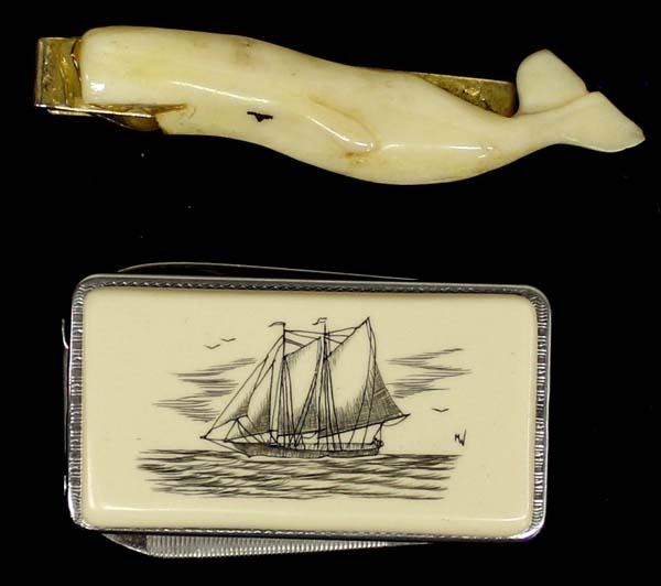 Scrimshaw Knife and Carved Ivory Whale Tie Clasp, longest measures 1'' x 2''