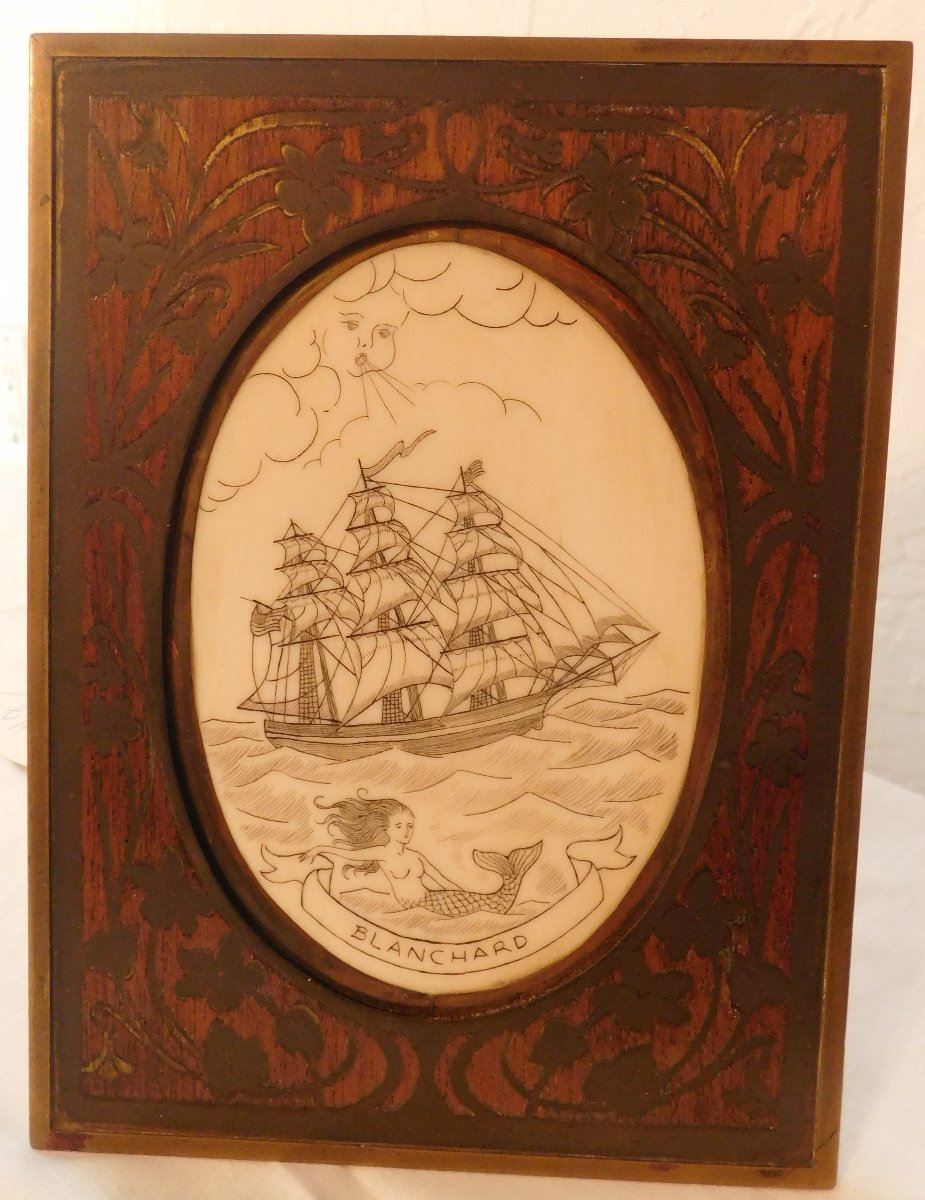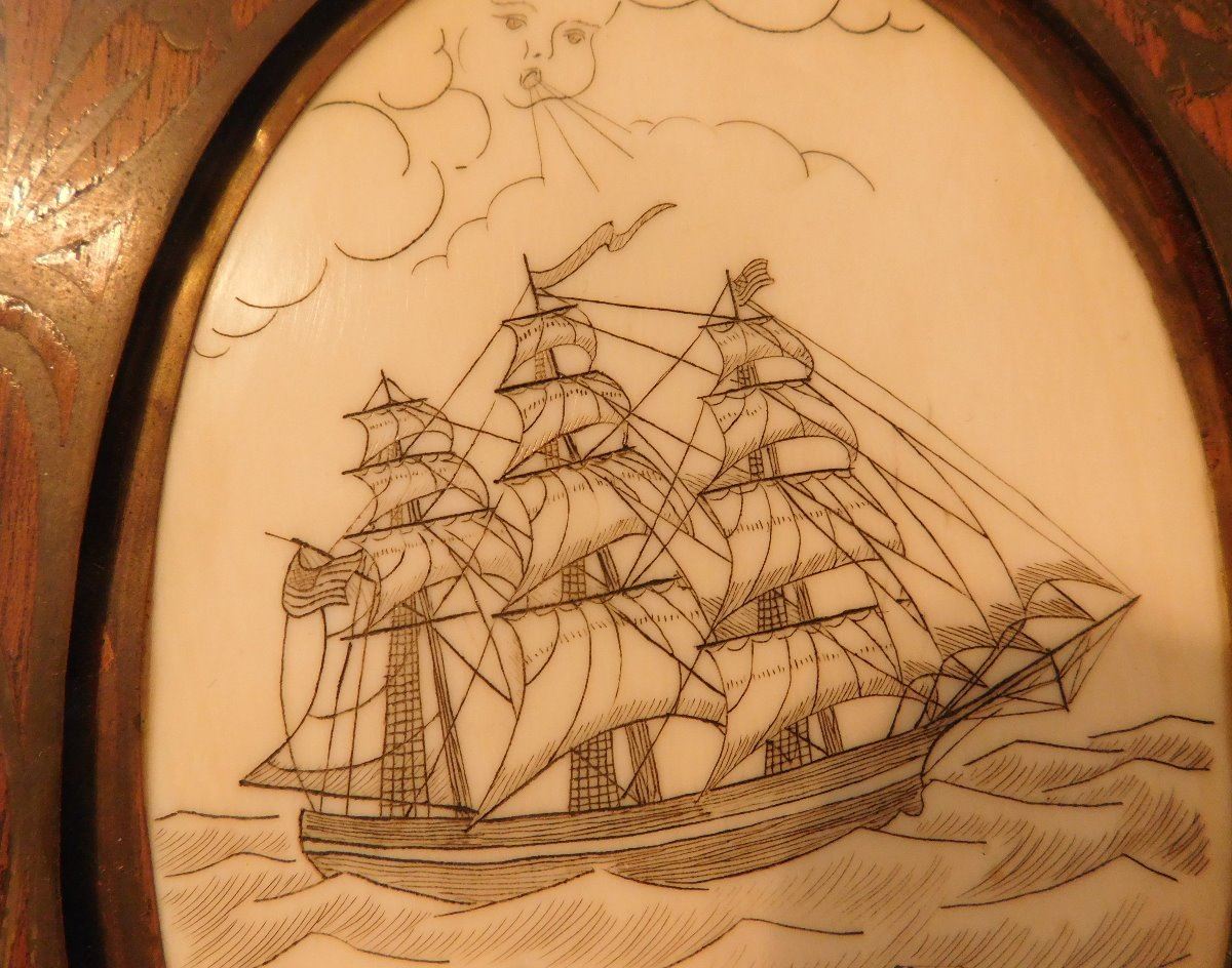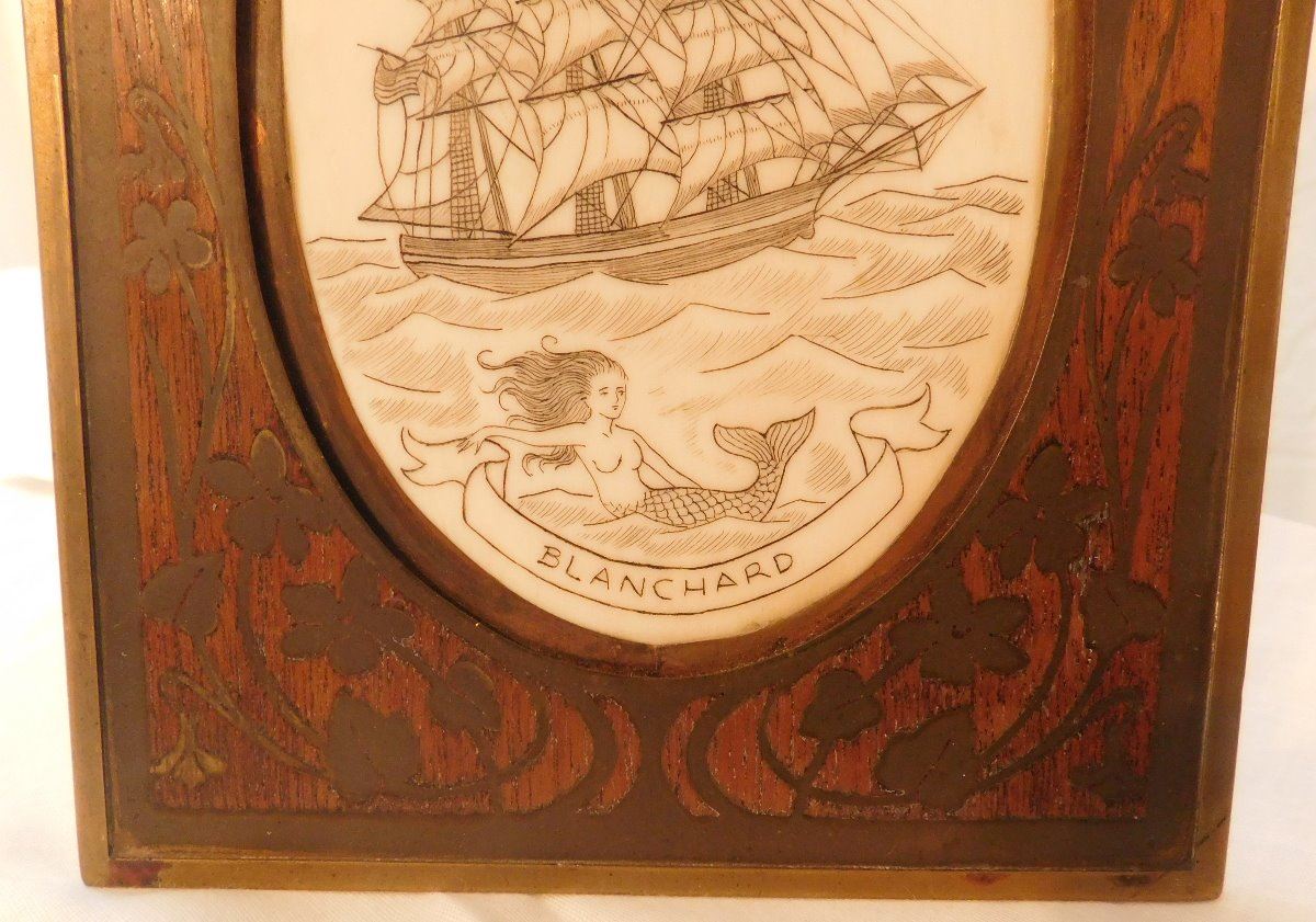 Scrimshaw Plaque of Ship, circa 1890s. Made of wood and bone, the item is 5.5" x 7.5" x 0.75". Alaska. Nice artwork. Condition: Good, see images. Shipping: $22.50 w/insurance and signature.