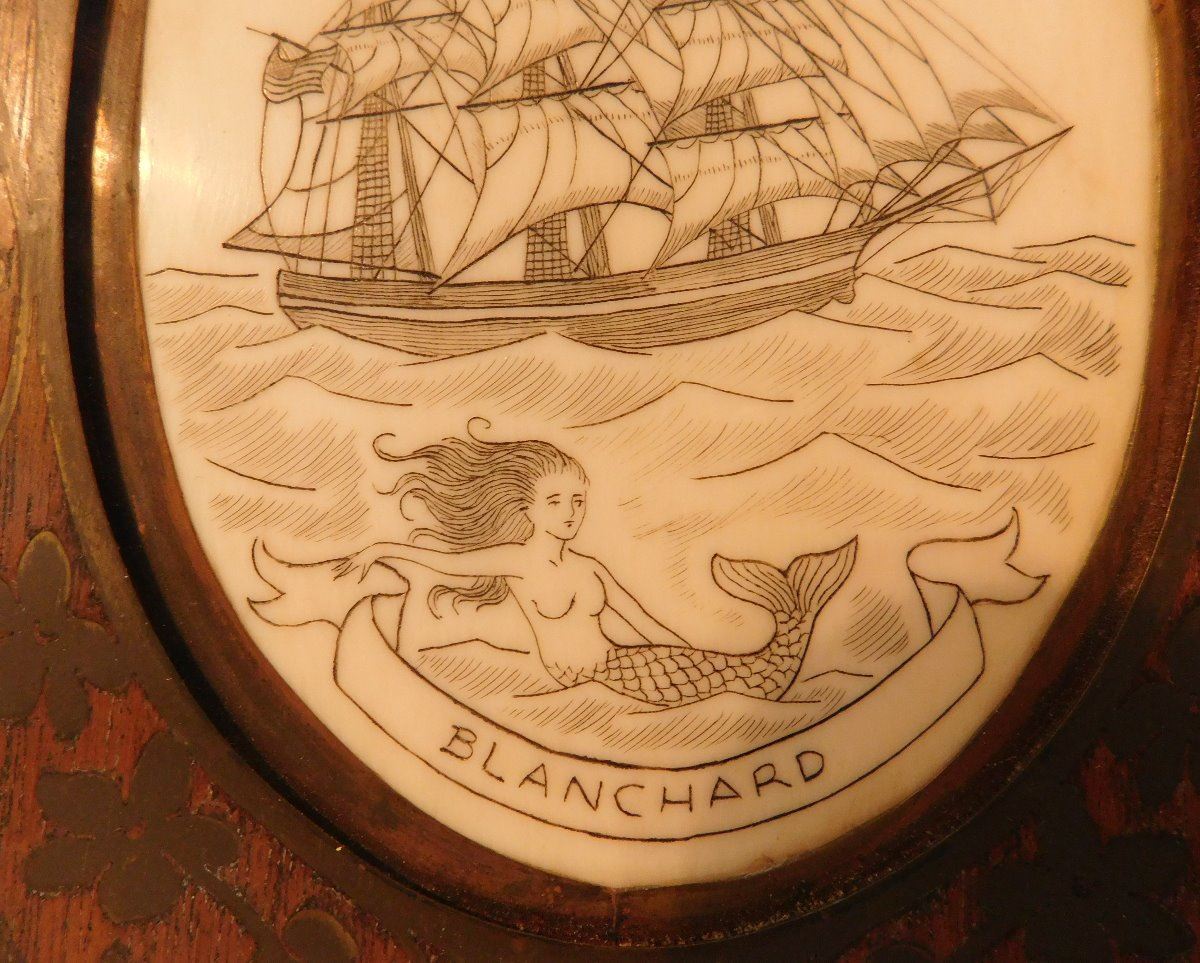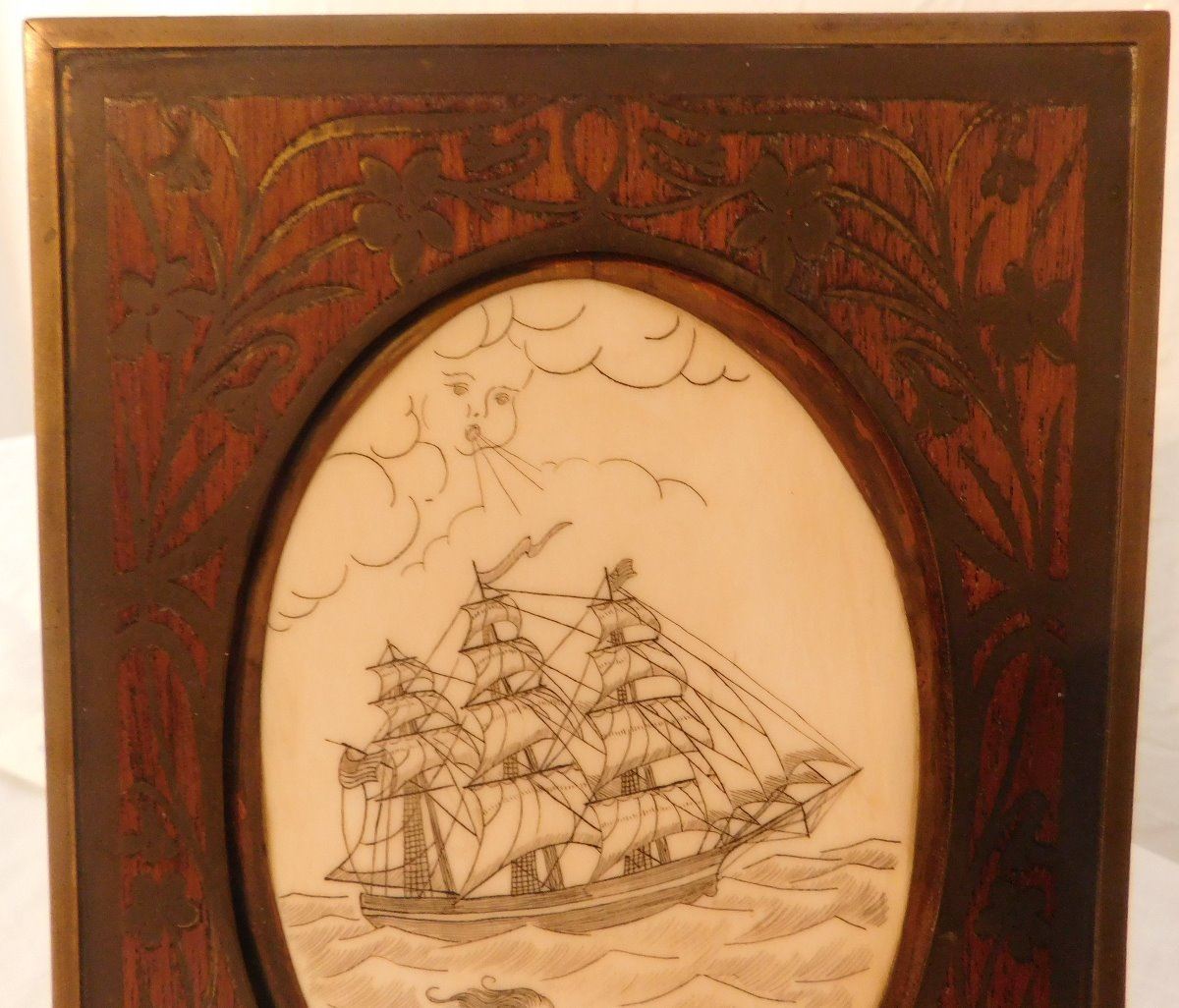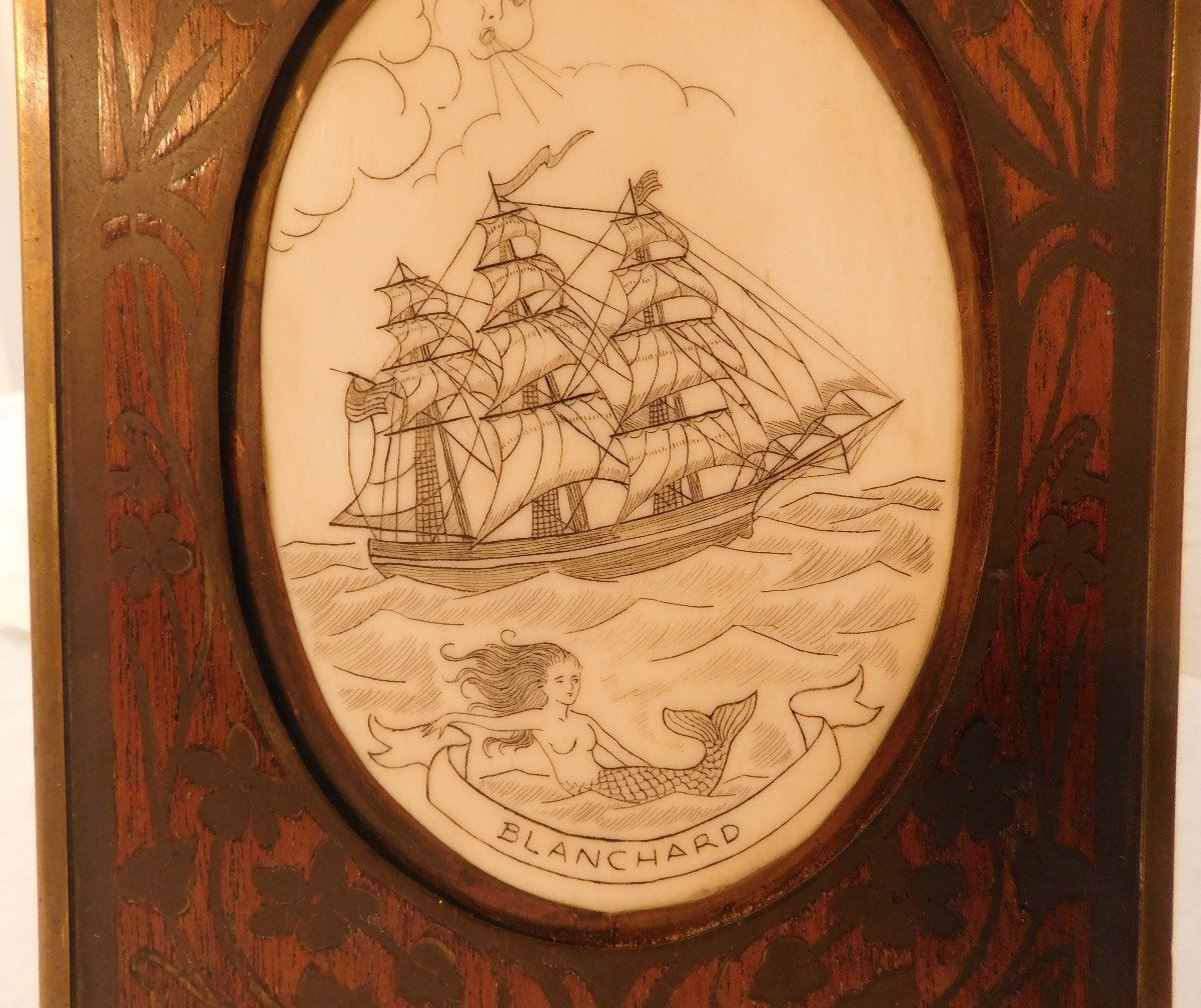 Scrimshaw Plaque of Ship, circa 1890s. Made of wood and bone, the item is 5.5" x 7.5" x 0.75". Alaska. Nice artwork. Condition: Good, see images. Shipping: $22.50 w/insurance and signature.