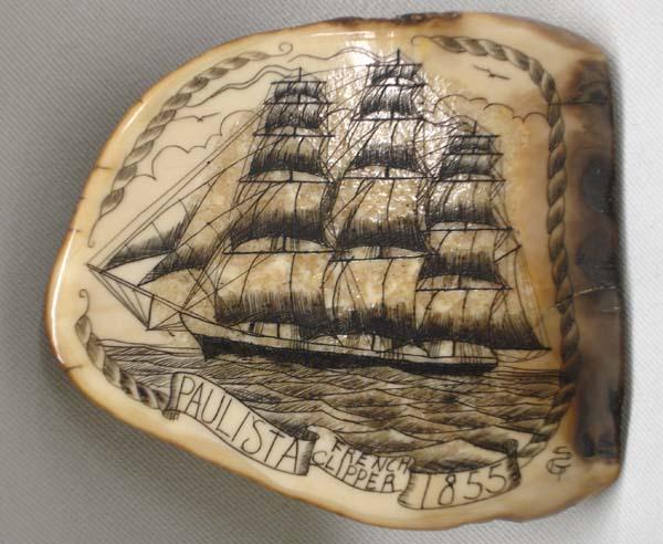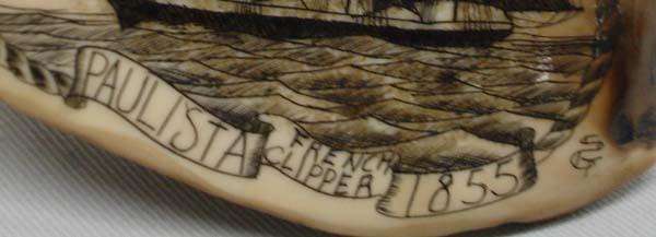 Scrimshaw on Fossilized Ivory Belt Buckle. The etching says at the bottom, ''Paulista French Clipper 1855'' and there is also the artist's signature, ''SG''. The buckle measures 2-5/8''x2-3/8''. The belt loop measures 1-3/4'' across. Buyers Pay Actual Shipping and Handling Charges(see terms and conditions for more information).